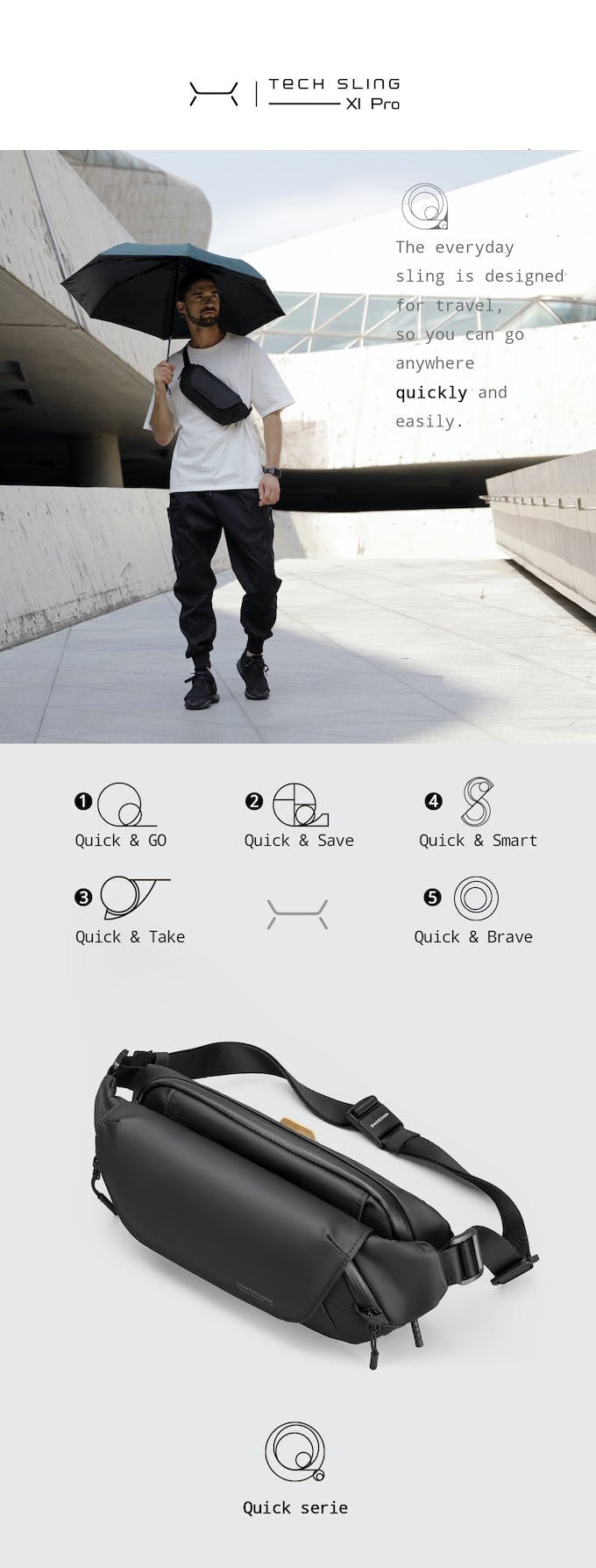 TECH SLING PRO X1は持つ人の、flexibly(柔軟に)、suddenly(突然に)、daily(日常的に)、freely(自由に)といったシチュエーションや要求に合わせたコンパートメントを設計しています。