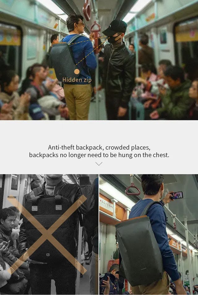 ファスナーを背面側に設置することで、外側からはファスナーの持ち手が見えないようになり、電車や人混みなどで外側から不正に開閉されにくいデザインとなっております。