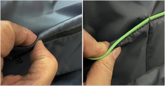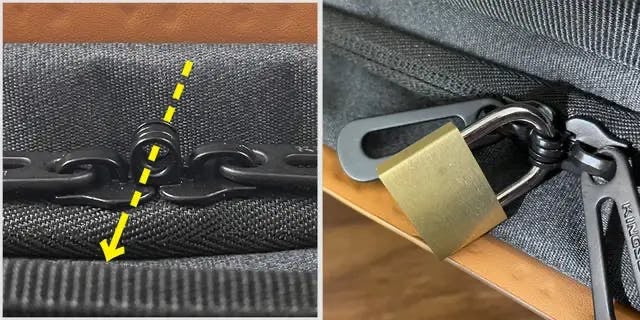 リングが左右のスライダーに付いており、ファスナーを完全に閉めると左右のスライダーがきれいに交わります。そこにお手持ちの、画像のような南京錠やダイヤルロックなどを取り付けていただくことで、外側から開閉しにくく、さらに内側では鍵もかかっている非常に開閉が困難な安心仕様にアップグレードいたしました。