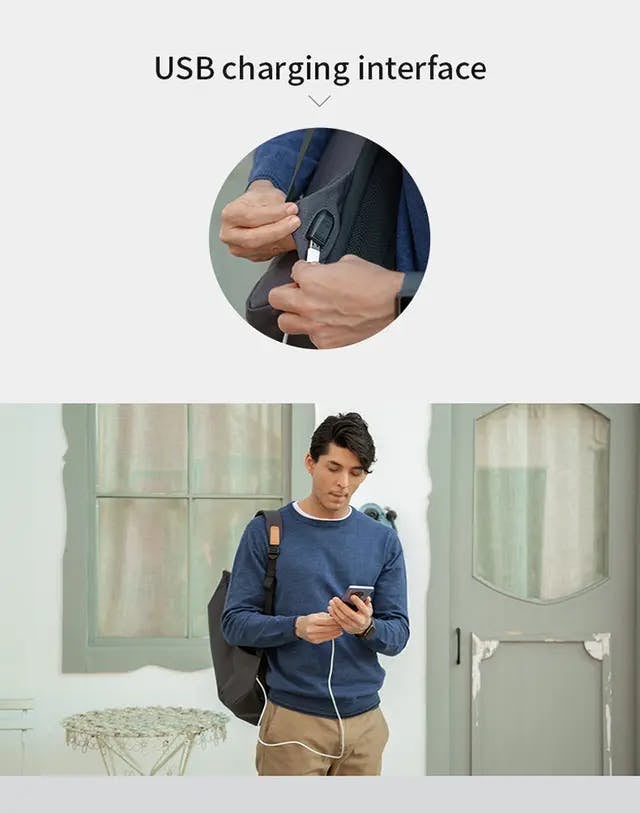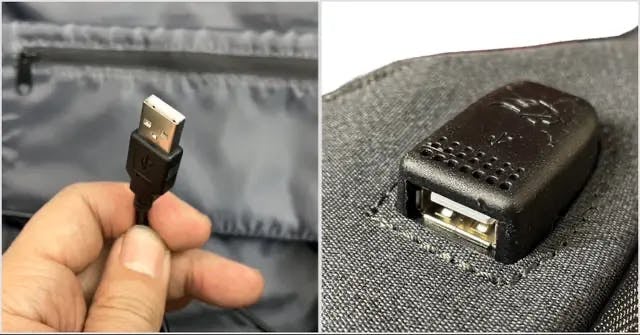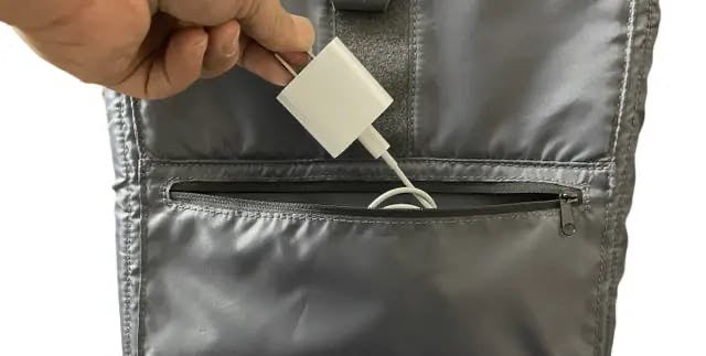 バッグの側面にUSBポートが、ポートからは内部にUSBケーブルが配線されております。そのUSBケーブルにお手持ちのモバイルバッテリーを繋げていただく。USBポートにはお手持ちの充電用ケーブルを差し込んでください。