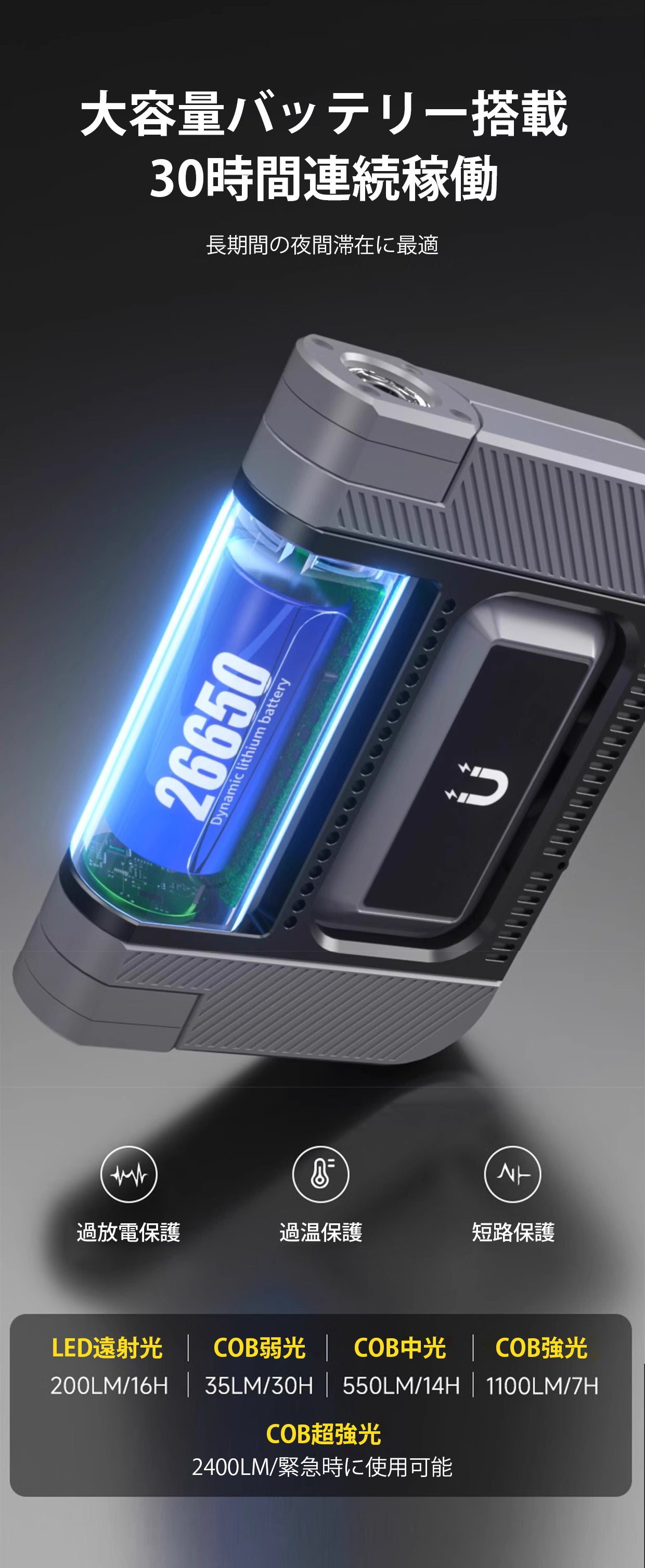 底面に強力マグネットを採用し、両手を自由に使えるため、夜間の車の整備やライトで照らしながらの物探しなど、暗い場所での作業がスムーズに行えます。