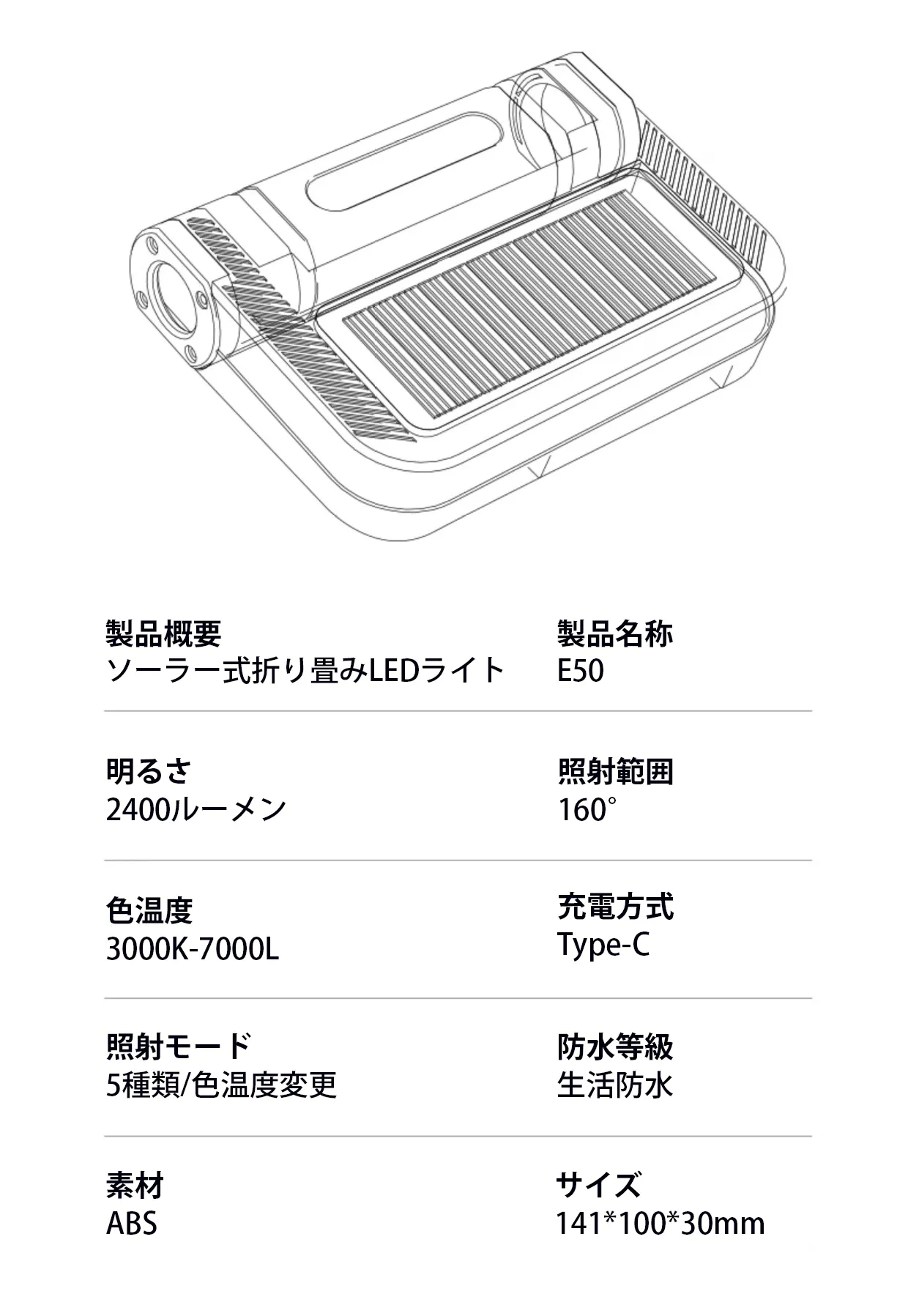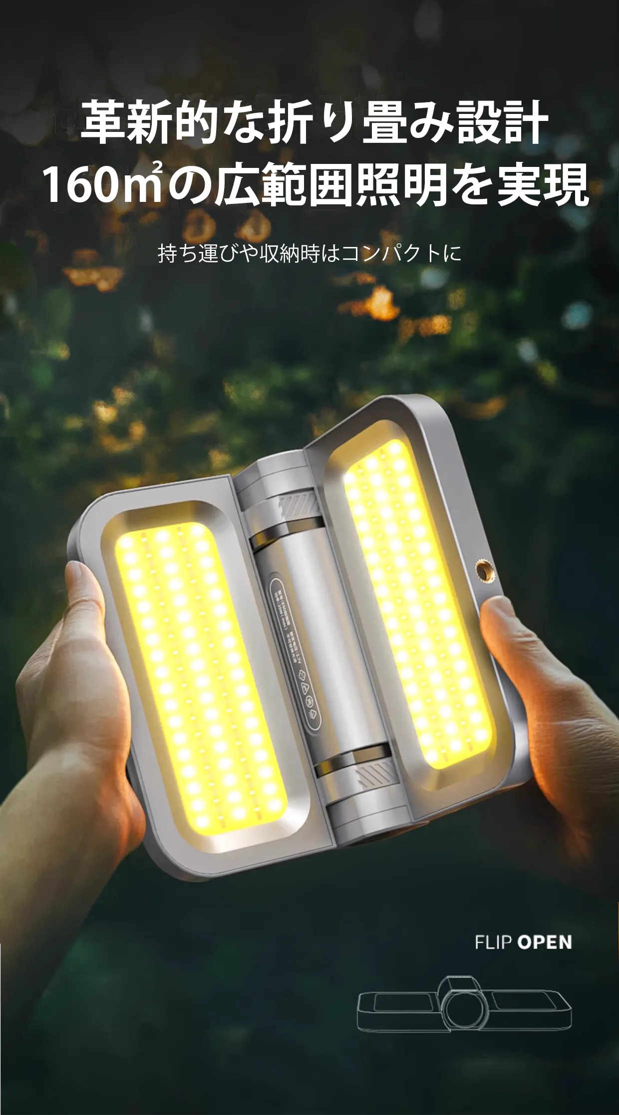 革新的な折り畳みデザインにより、160㎡の広範囲照明を実現し、アウトドアや防災時にも頼れる明るさを提供します。