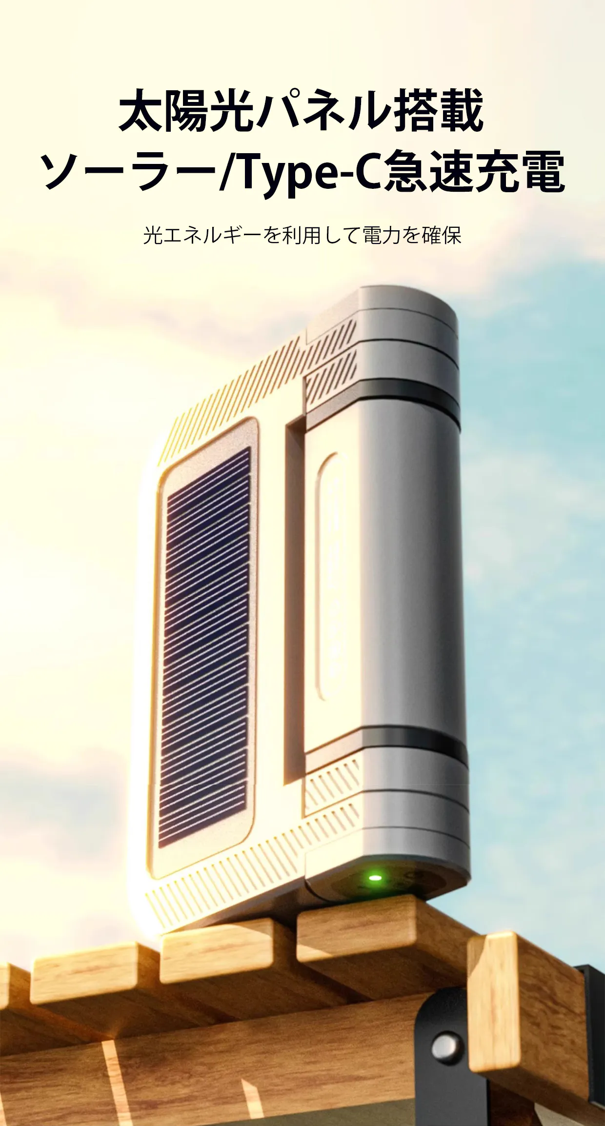 本製品は太陽光/Type-Cの高速充電に対応しており、キャンプや災害時に懐中電灯の電源が切れて困ることは無くなります。
