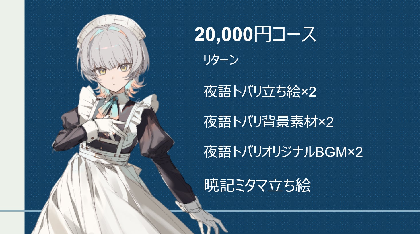 リターン:暁記ミタマ立ち絵、夜語トバリ立ち絵×2、夜語トバリ背景素材×2、夜語トバリオリジナルBGM×2