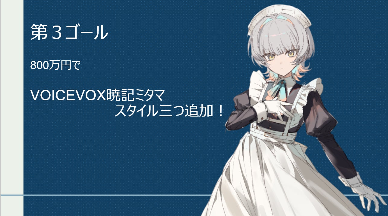 現在第三ゴールとしてすでに初期ゴールで達成した暁記ミタマのスタイルの追加を目指しております。目標額800万円を達成した場合実装を予定しております。
