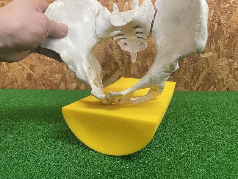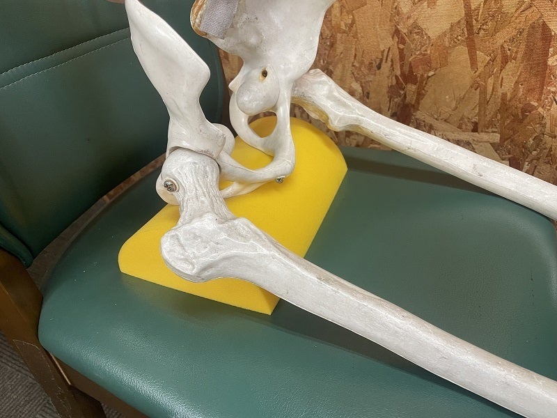 それから15分ほどして何気なく加工に行こうと立ち上がり工場の方に歩き出したのです。1歩2歩3歩とその時、私の脳に衝撃が走ったのです‼いつもの腰痛爆弾を抱えた私の重苦しかった腰が例え一時的にせよ嘘のように軽く心地良くなっていたからです。「えっ?この半円中の高反発ウレタンにお尻だけで座ったから?骨盤っていったいどうなってるんだ⁉」と急いでインターネットで医学用の正確な骨盤模型を男女分仕入れて、三位一体の骨盤の仕組みを腑に落としながらそれに座り続ける日々が始まったのです。