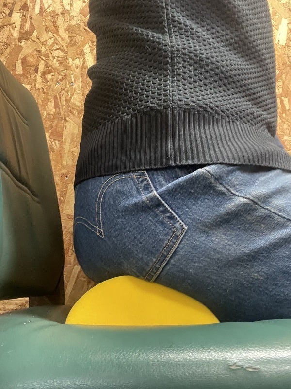 ところが440ニュートンもの高反発のウレタンを半円中に加工するにはプレスではできず手加工でしかできない。当初は失敗作が出たものの、当時アルバイトに来てくれていた近所の上野さんが加工回転台を作ってくれた事でようやくきれいに加工できるようになり、約500個ほどのオーダーを貰えたのです。ところが失敗作が20個ほど残ったのですが、貧乏会社の社長である私は捨てるのがもったいなくってたまたま私がデスクワークで座り出したのです。もちろん私は男であり妊婦さんのように骨盤を広げる必要がない(笑)。そうして半円中の頂点に左右の坐骨を乗せて座り出したのです。