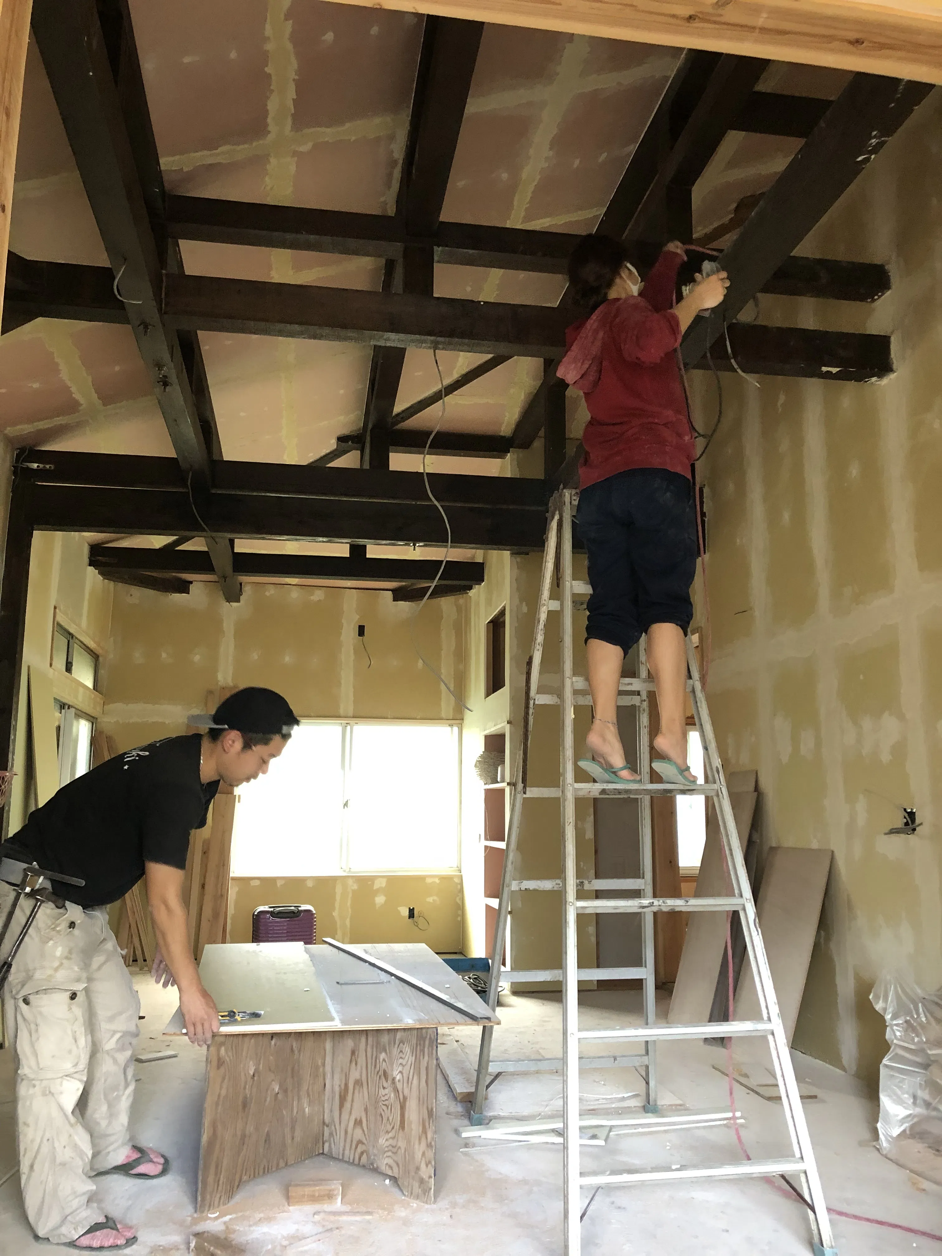 プロジェクトリーダーであるマムの妊娠中、出産入院中もへい兄さんとちゃずが作業を進めてくれていたお陰で、天井が完成しました。