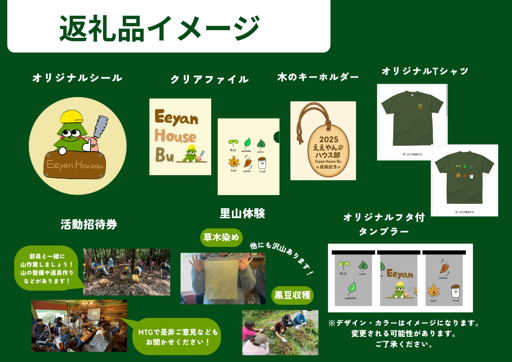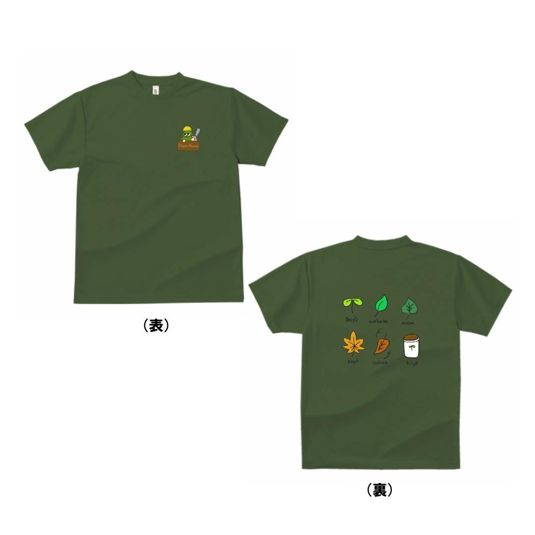思わず山に入りたくなるようなデザイン!胸元には、お馴染みええやんハウス部のキャラクター!ツリーハウスの成功を見守って貰っています!裏側には、メンバーの呼び名の葉っぱイラストが描かれています。カラーはオリーブで、山にも町にも馴染み、通気性が良いメリットもありつつオシャレを楽しめるA級Tシャツです!