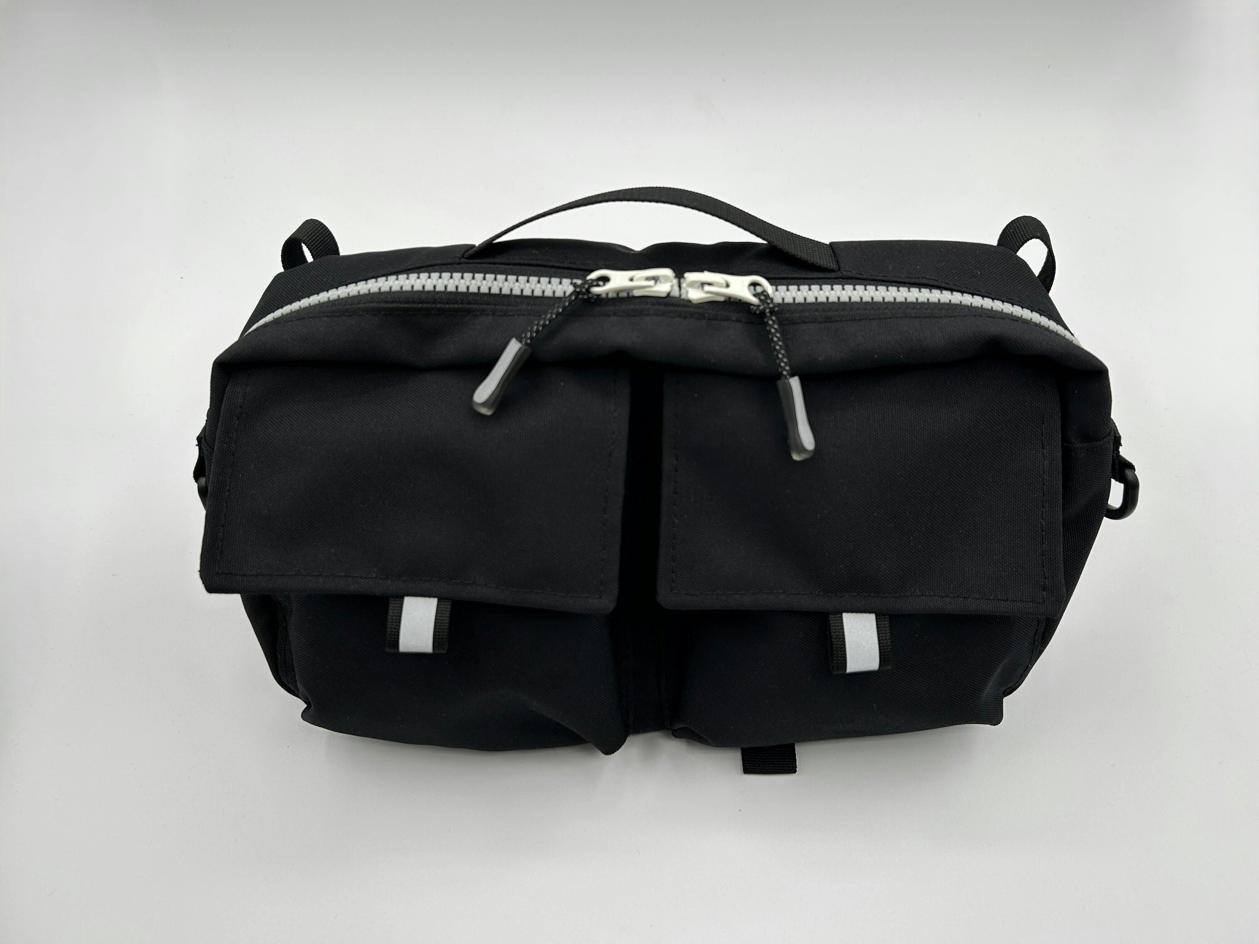 一見、普通のウエストポーチに見えますが、蓄光素材や反射素材を使い、暗闇で光ります。