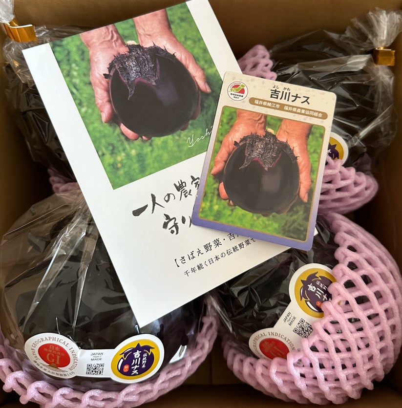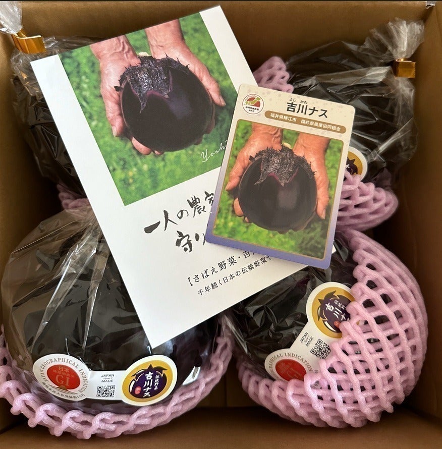 私たちは、地域の素晴らしい特産品を意外と知らないことに気づきました。伝統野菜というだけあって、フランス ボルドー地区で生産されたボルドーワインのように、風味豊かな野菜の生育に適している福井県鯖江市で生産されたナスのみが、「吉川ナス🄬」を名乗ることができるのです。このように産地の由来がわかる地理的表示(GI)で、信頼できるブランドであることを証明できます。