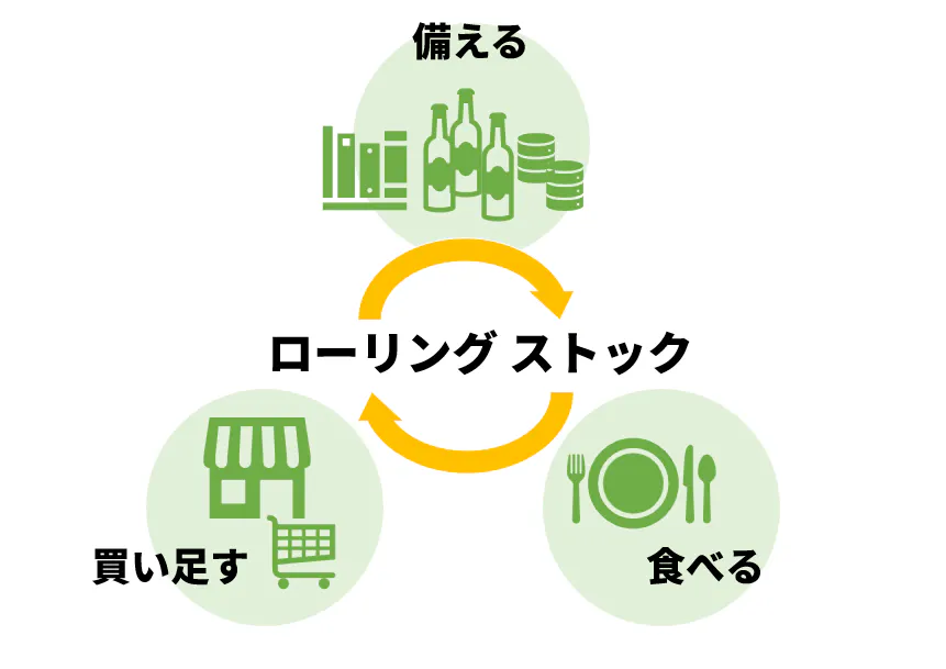 ※ローリングストック:普段の生活で利用している食品や日用品を少し多めに備蓄し、消費した分を買い足すことで、常に一定の備蓄を保つ方法