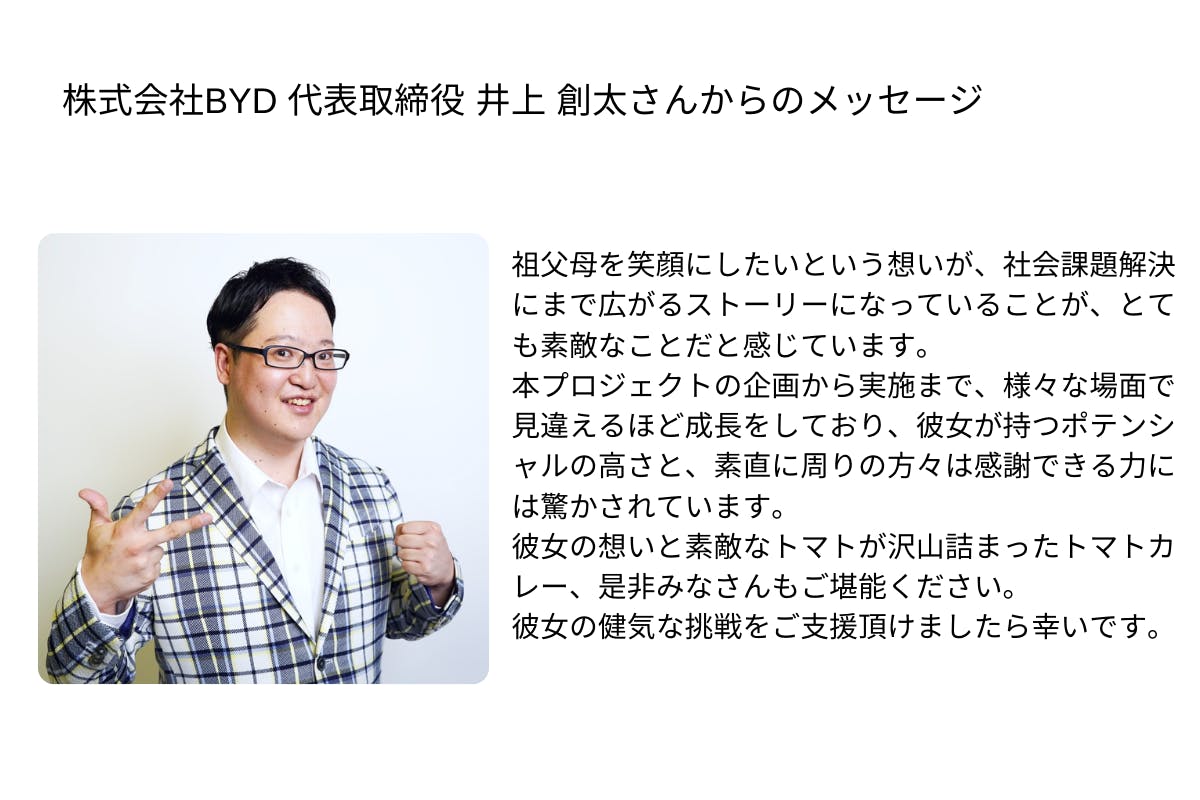 茨城県のトマト嫌いの高校生が作った、祖父母のトマトで一番おいしいカレーを届けたいのプロジェクトをご覧いただきありがとうございます。
