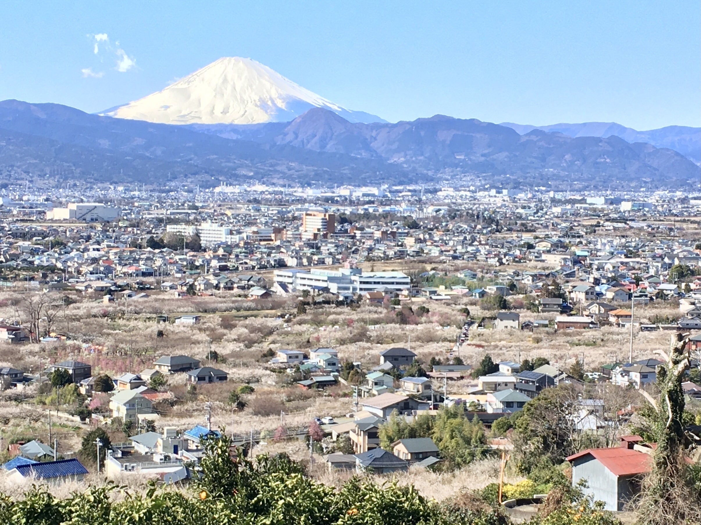 東京から直線距離で約80km。「曽我梅林」で知られる曽我地区は、美しい自然と歴史が息づく場所です。梅林には3万5000本もの梅の木が広がり、2月には一斉に花を咲かせます。その背後には雄大な富士山がそびえ、芳醇な花の香りと共に訪れる人々の心を癒す絶景となっています。6月にはたわわに実った梅の実を収穫し、梅雨明け8月には露路で梅干しを干す光景があちこちで見られます。