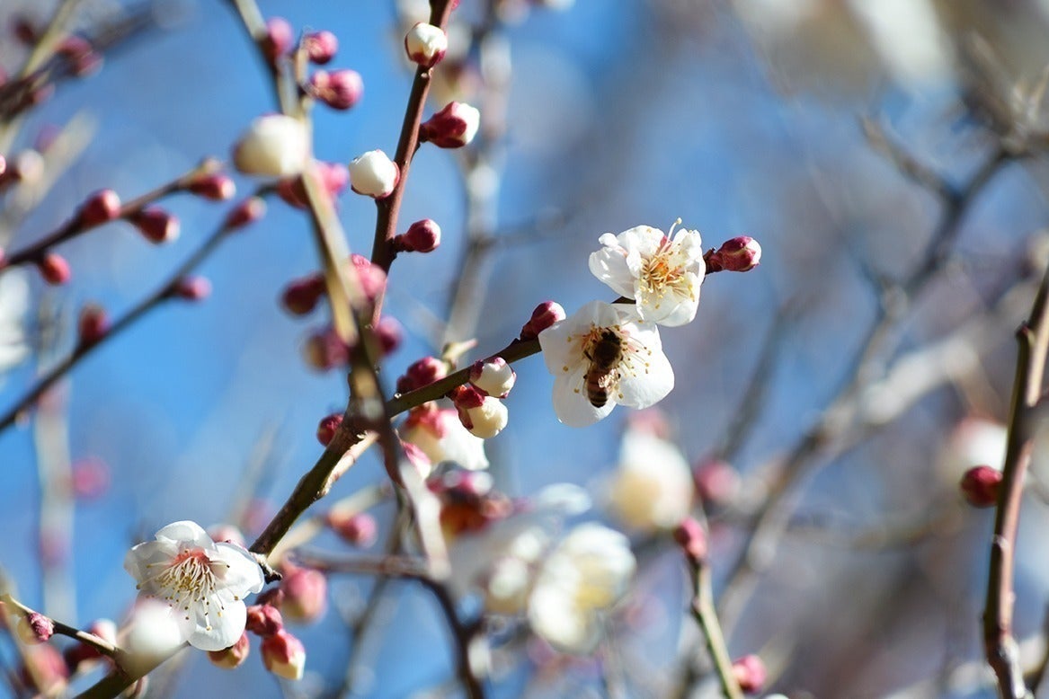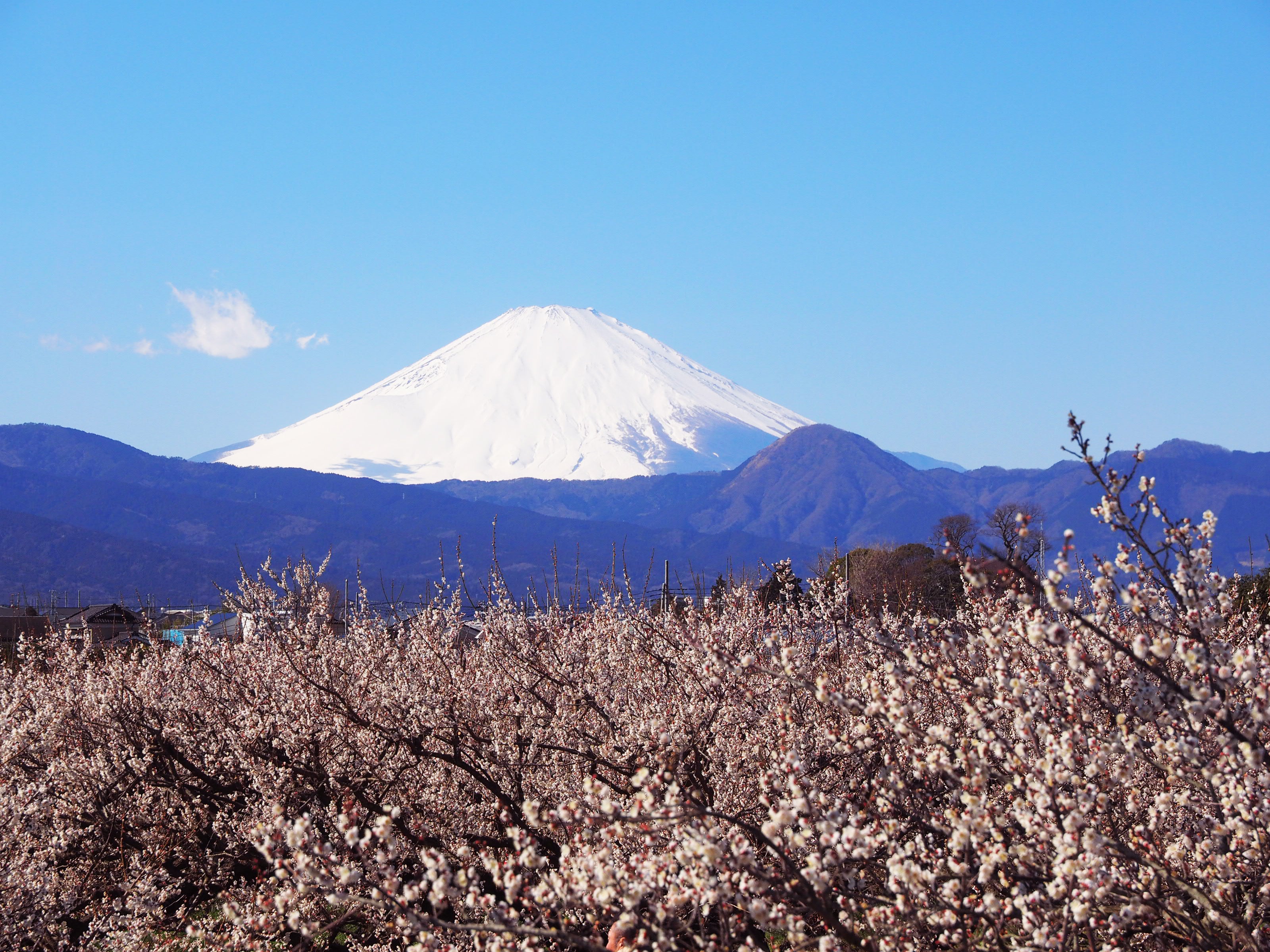 東京から直線距離で約80km。「曽我梅林」で知られる曽我地区は、美しい自然と歴史が息づく場所です。梅林には3万5000本もの梅の木が広がり、2月には一斉に花を咲かせます。その背後には雄大な富士山がそびえ、芳醇な花の香りと共に訪れる人々の心を癒す絶景となっています。6月にはたわわに実った梅の実を収穫し、梅雨明け8月には露路で梅干しを干す光景があちこちで見られます。