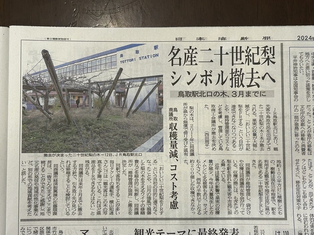 ある朝新聞に目を通していたら「鳥取駅前の二十世紀の梨撤去」の文字が目に飛び込んできた。