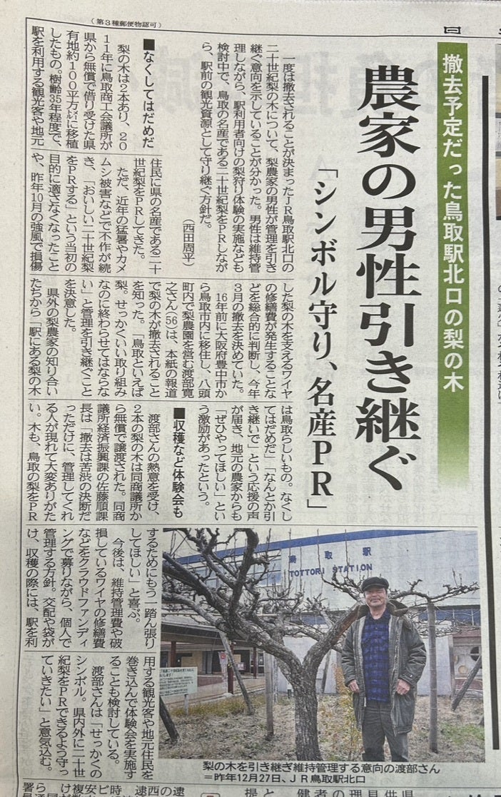 現在、鳥取県下のメディアさんを通じて駅前梨の木の復活プロジェクトの案内及び支援の呼びかけを行っている。
