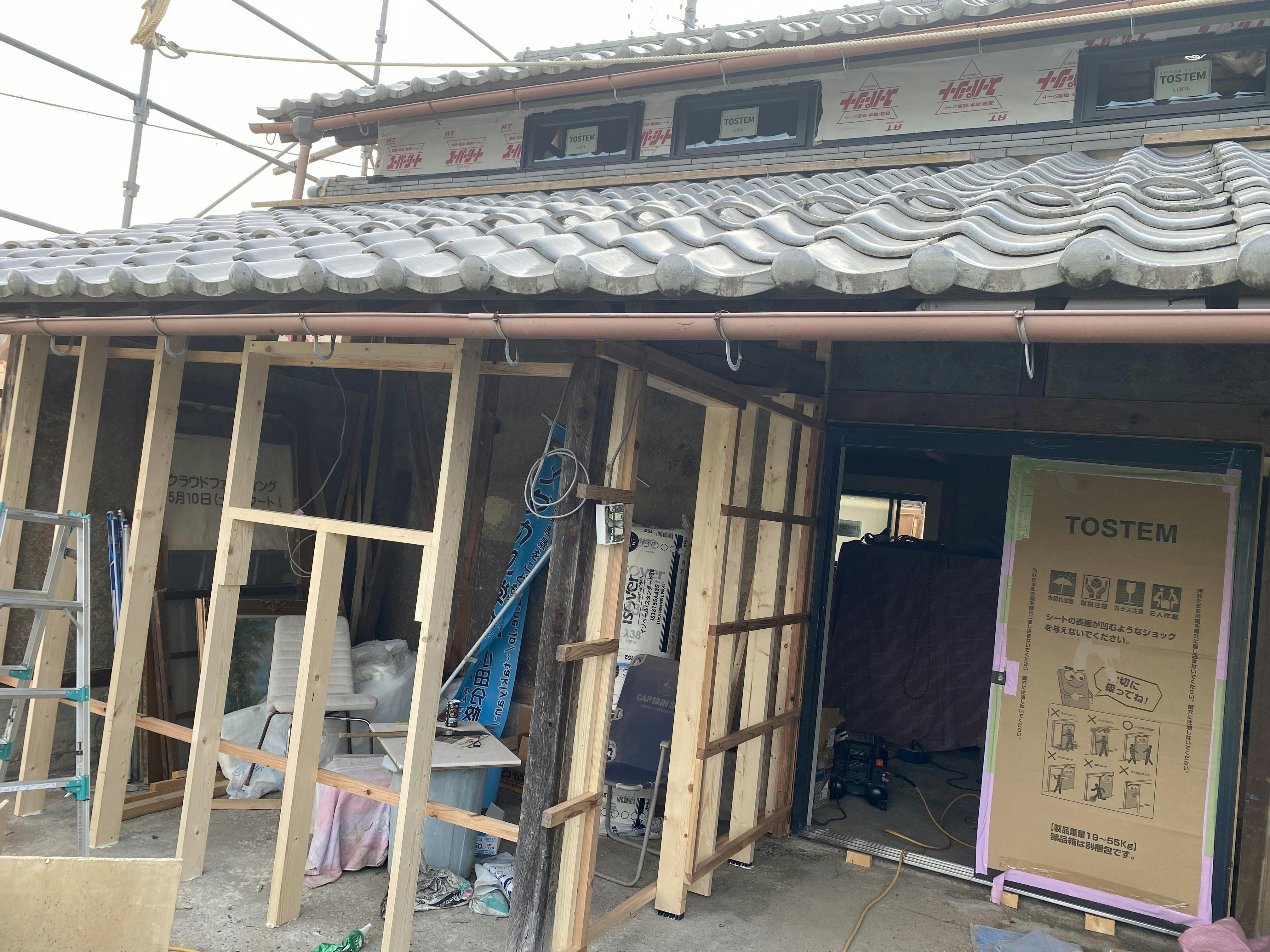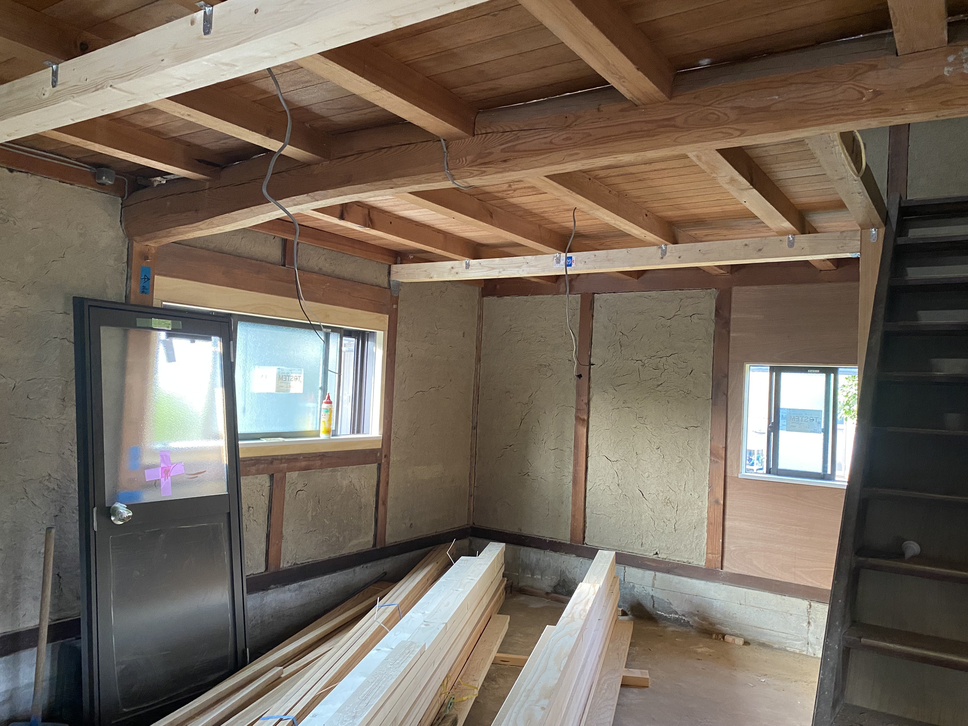 天井(2階床)の補強やサッシの嵌め込みなど、徐々に形になってきました。
