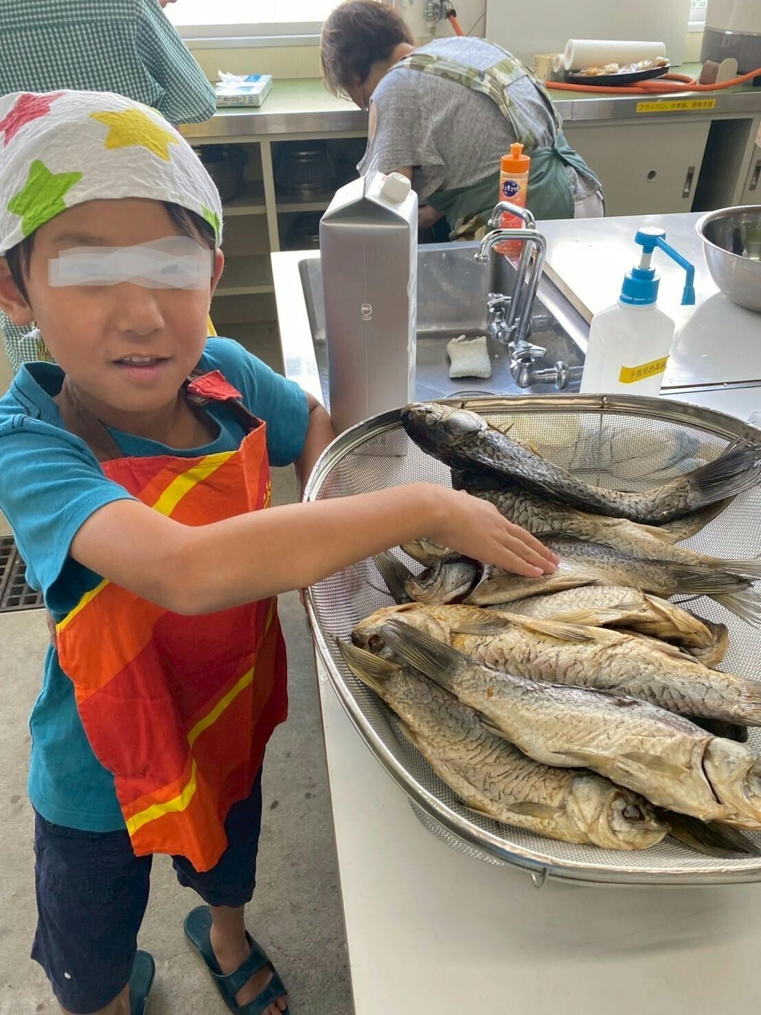 お昼には、みんなが捕まえてきた魚たちを食卓にならべ、天ぷらや塩焼きにして自然の恵みをおいしくいただきました。