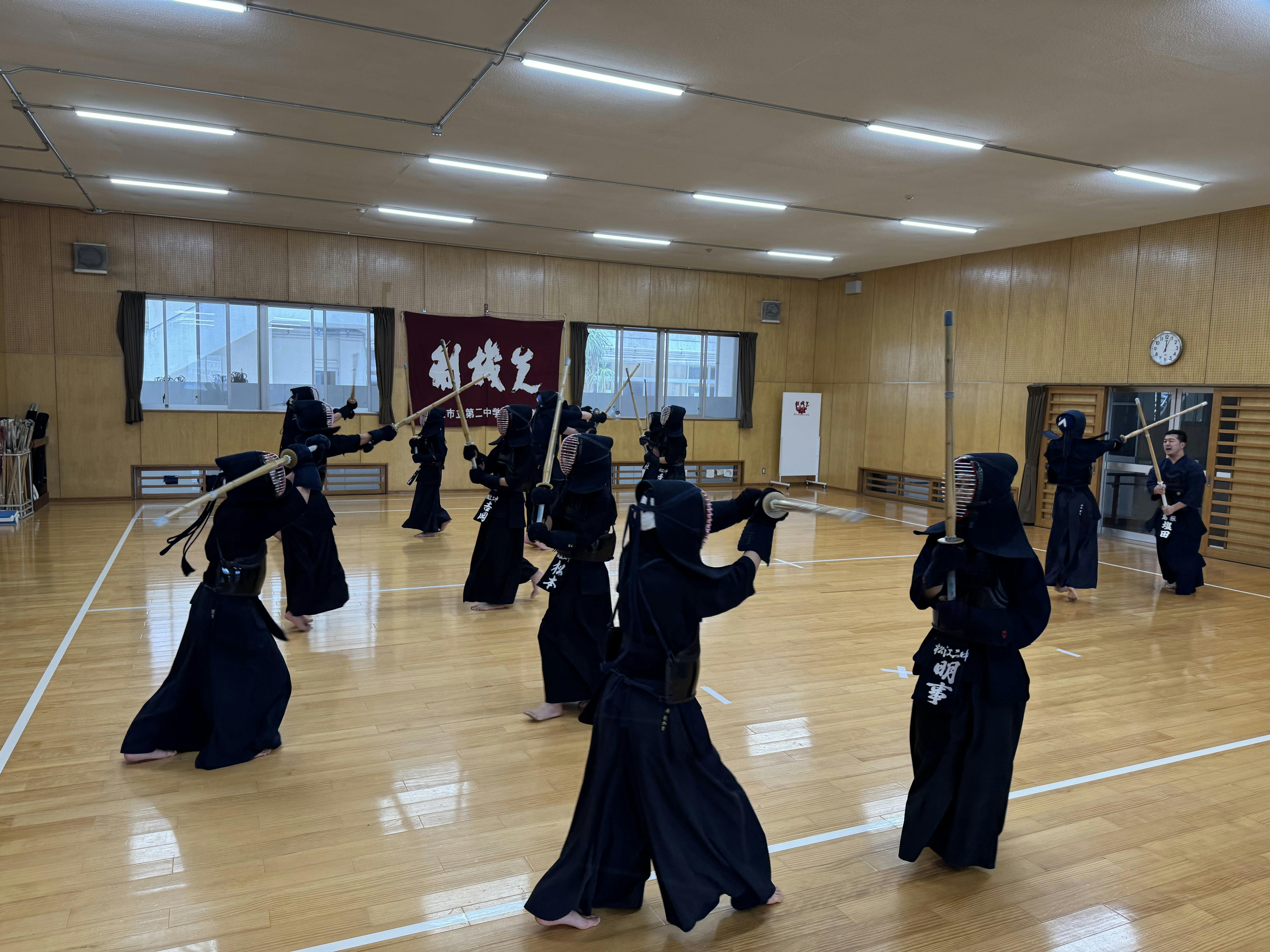 剣道部は現在、男子11名・女子4名の計15名の部員で、剣道に対する情熱とチームの絆を大切にし、日々稽古に励んでいます。私たちの指導者である錦織先生と塩田先生は、剣道における技術だけでなく、精神的な成長も重視して指導してくださり、また井上先生につきましては、こども達のメンタルケアや全体のサポートをしてくださっています。部員一同、剣道を通じて学ぶことの喜びや、仲間と共に切磋琢磨することの大切さを日々実感しています。