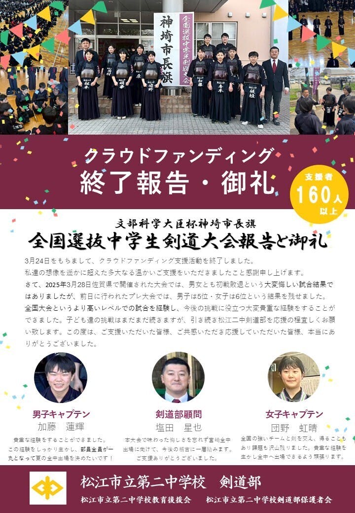 2025/04/29 08:10この度は、松江市立第二中学校剣道部のクラウドファンディングに多大なるご支援を受け賜り、心より感謝申しあげます。おかげさまをもちまして目標金額の100万円を達成することができました。期待と不安が入り混じるプロジェクトではございましたが、このような大成功を収めることが出来ましたのは、総勢166名様(内、CAMPFIREサイト以外からのクラウドファンディングへのご寄付48名様)からの温かいご支援ご協力を賜りました皆様方のおかげに他ならず、感謝の念に堪えません。教育後援会をはじめ、関係者一同深く感謝申しあげます。また、ご支援だけでなく数々の応援メッセージや励ましのお言葉も私たちや生徒たちにとって大きな励みとなりました。今回の全国大会では男女共悔しい結果となりましたが、大舞台での緊張感やプレッシャーの中で戦った経験は、子どもたちにとって大きな財産となりました。夏の全中予選に向けて、さらに一層の精進を重ね今後の稽古に励みます。皆様のますますのご発展とご多幸を祈念し、本クラウドファンディングのお礼のご挨拶とさせていただきます。 もっと見る