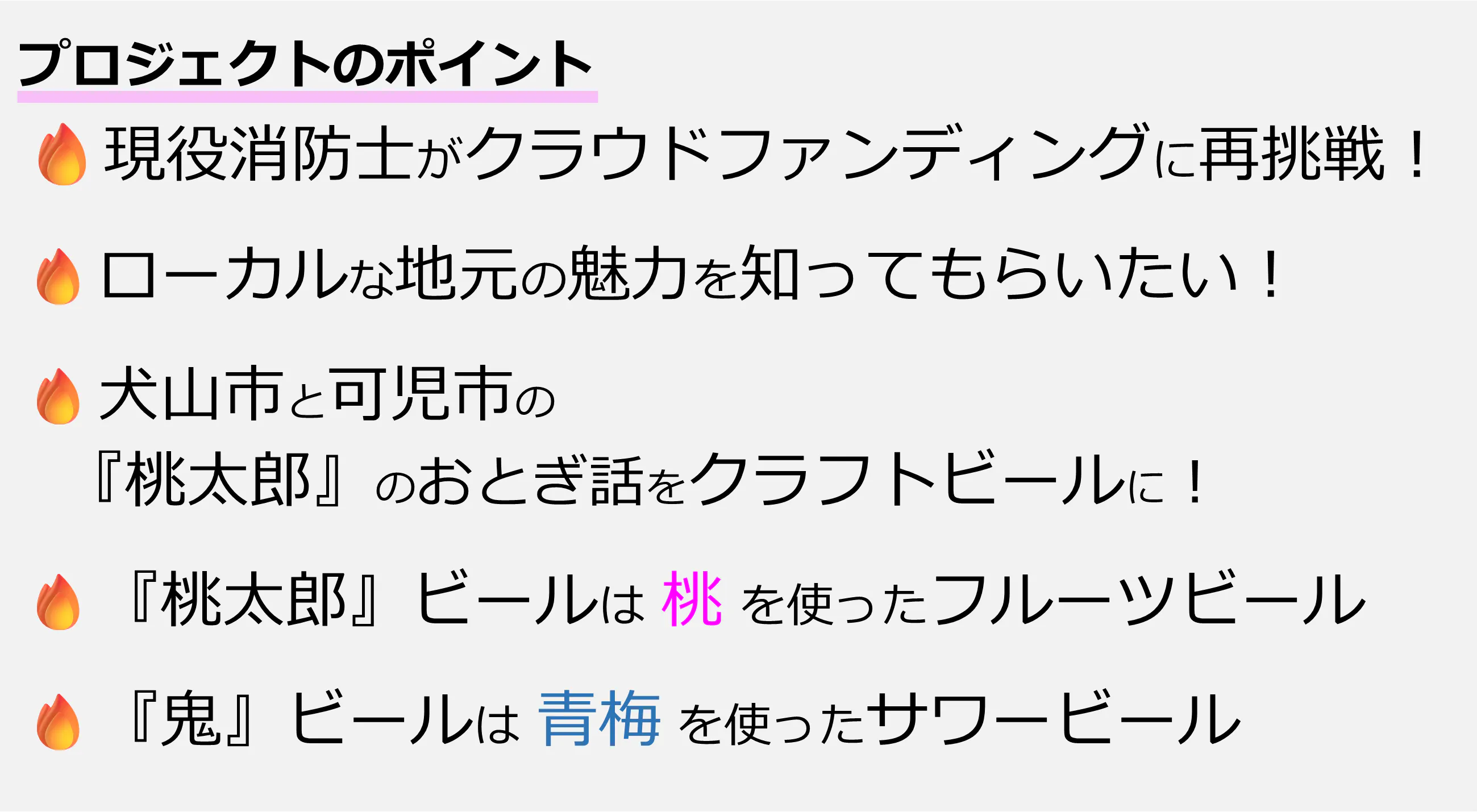 今回のプロジェクトの目的は、犬山と可児が舞台となった『桃太郎のおとぎ話』をモチーフにしたクラフトビールを作成し、犬山と可児のローカルな魅力を多くの方々に知っていただきたいというものです。