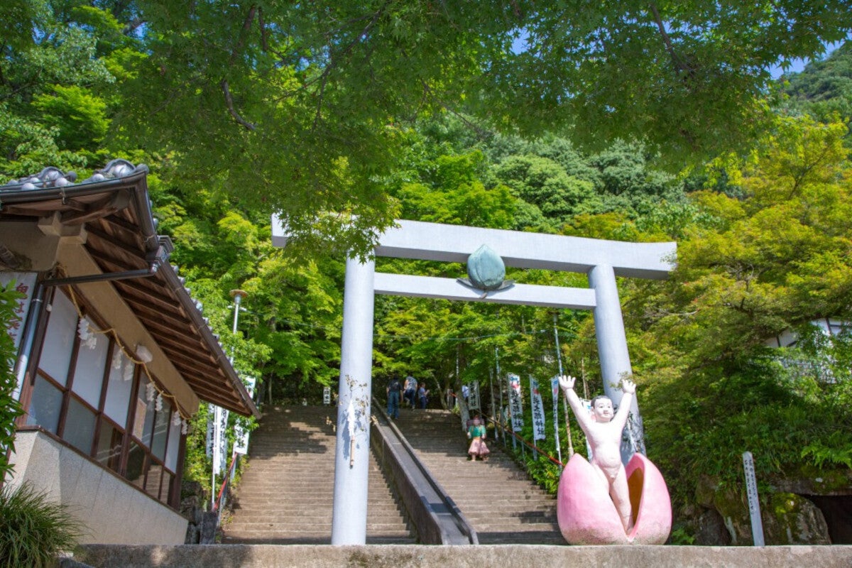 鳥居の前で産声を上げる桃太郎の像