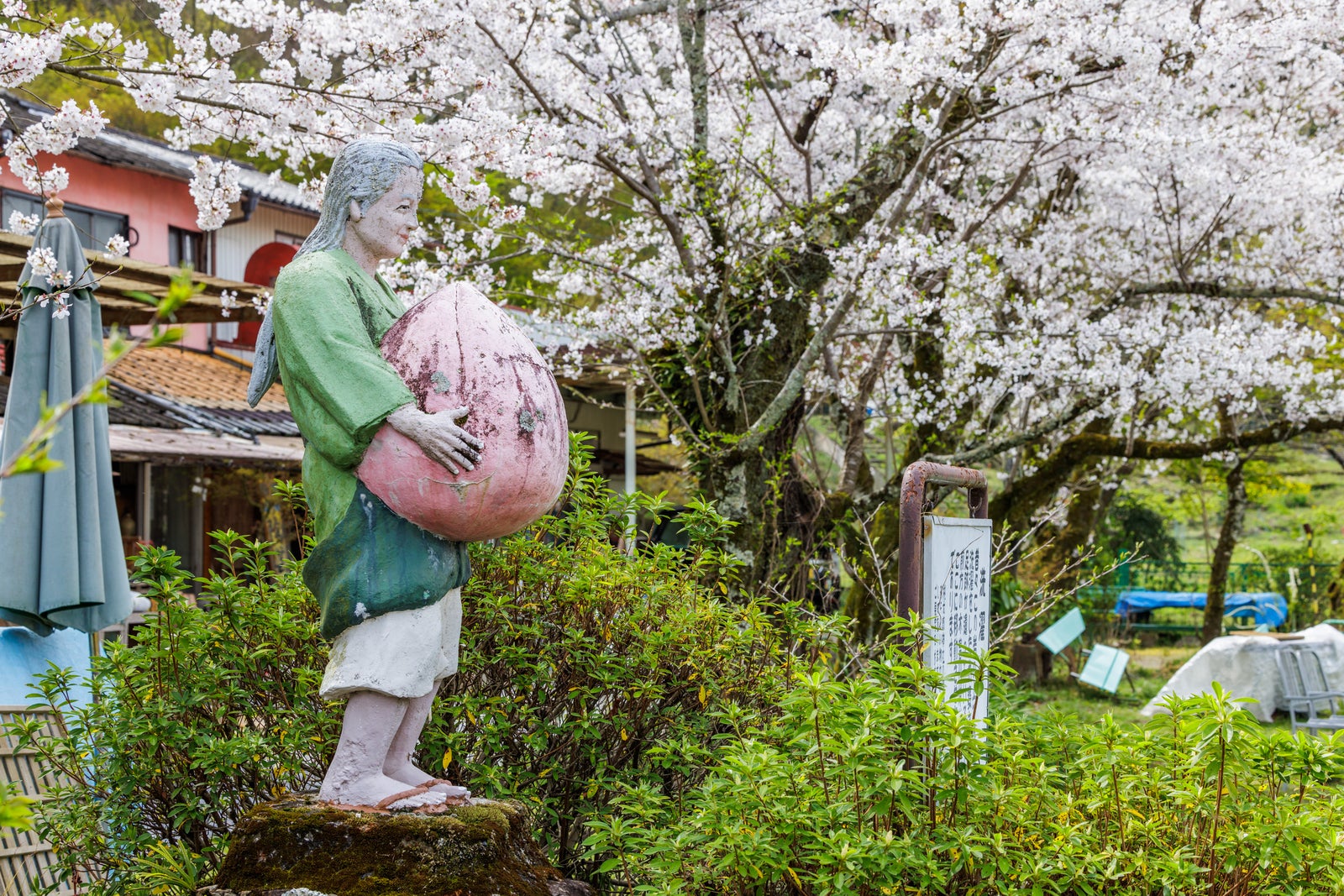 桃を抱えるおばあさんの像