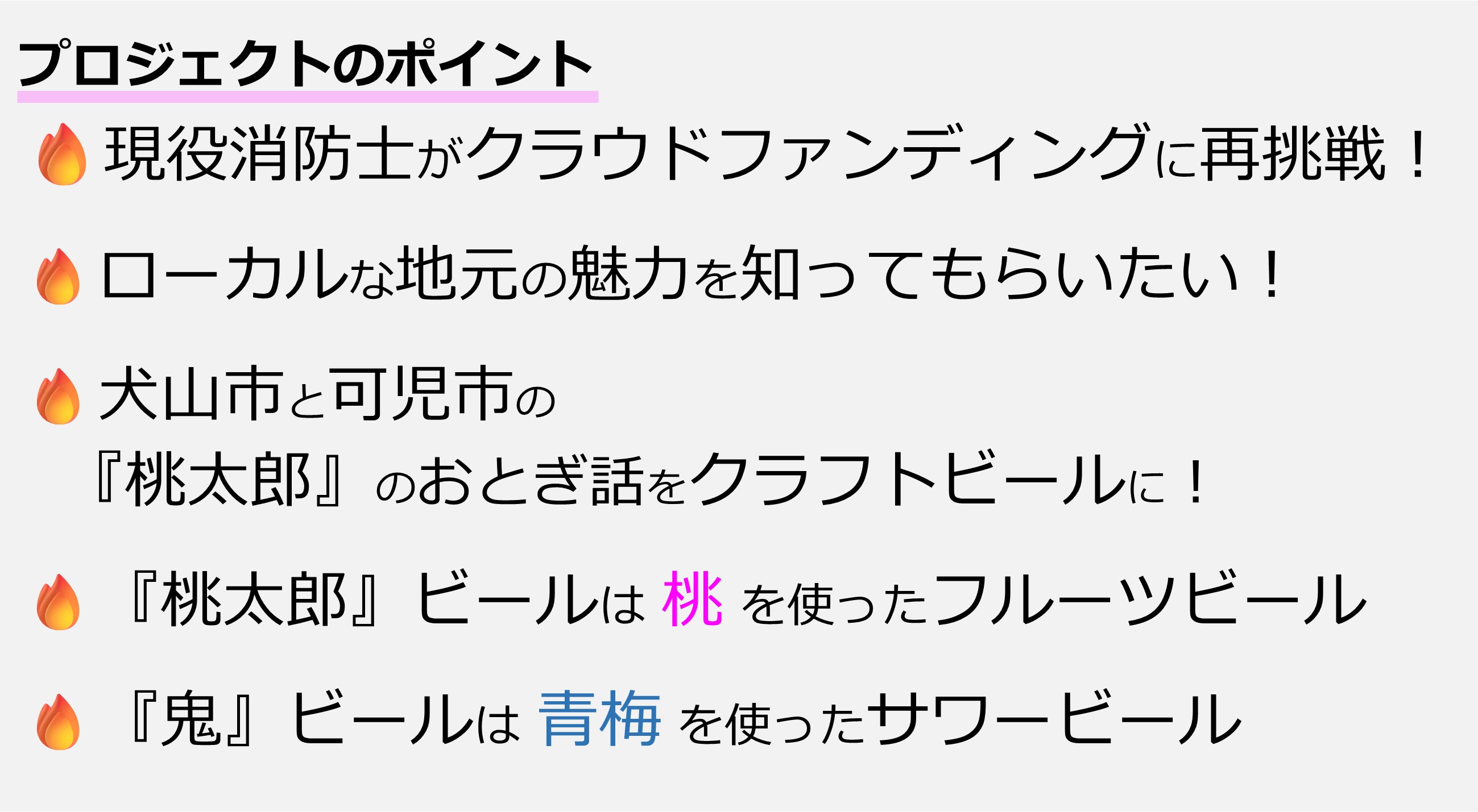 今回のプロジェクトの目的は、犬山と可児が舞台となった『桃太郎のおとぎ話』をモチーフにしたクラフトビールを作成し、犬山と可児のローカルな魅力を多くの方々に知っていただきたいというものです。