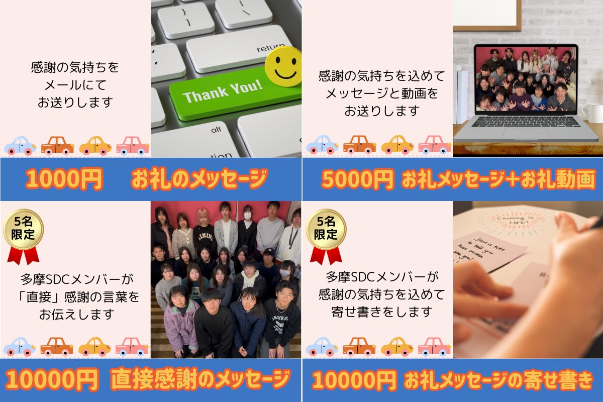リターンとして好評だった「ゴーカートファストパス」と「多摩SDCアルバム」を追加しました!