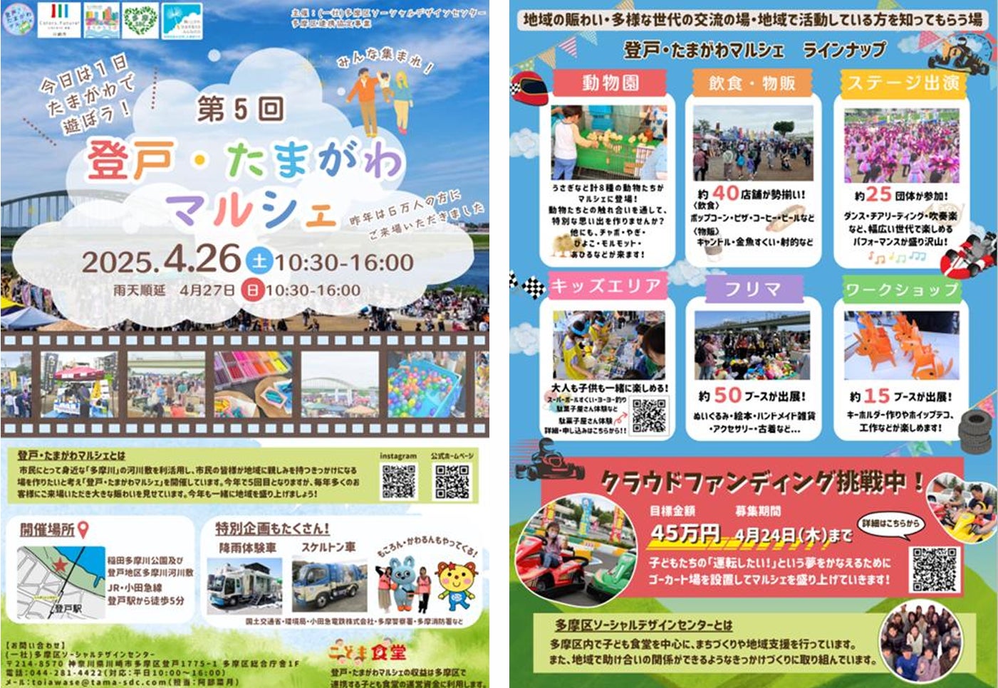 2025/05/09 08:33先日無事に第5回登戸・たまがわマルシェを開催しました!当日の様子を報告させていただきます。朝の準備当日ボランティア打ち合わせ当日は出店・出展・出演者だけでなく地域の中高大学生や大人など沢山のボランティアの方にお手伝いいただきました!ステージステージ会場ステージでは合唱、吹奏楽、ダンスなどさまざまな演目が行われました!キッズ駄菓子屋さん体験ゴーカートスーパーボール、ヨーヨー、駄菓子屋さん体験、ボーリング、動物園、ゴーカートのエリアを設置しました!ロバ ロバさん作りをおこないました!SDC飲食わたあめ、たい焼き、フランクフルト、ドリンクを販売しました!その他にもフリーマーケット、ワークショップ、降雨体験などなど多くの方に楽しんでもらえるようなコンテンツを多数ご用意しました!当日は沢山の方にご来場いただきました。マルシェに足を運んでくださった皆さまありがとうございました!そして出展・出店してくださった方、ステージに出演してくださった方、クラウドファンディングにご支援くださった方、当日ボランティアで来てくださった方などなど書ききれないほど多くの方にさまざまな形で支えられてマルシェを開催することができました。皆さまと一緒にマルシェを作り上げ、地域を盛り上げることができたと実感しております。改めて感謝申し上げます。多摩SDCメンバーこれからも多摩区ソーシャルデザインセンターでは子ども食堂をはじめ、様々なイベントを企画して参ります。今後の活動にもお力添えいただけますと幸いです。 もっと見る