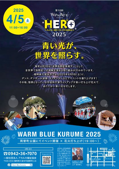 例年通り、市役所のブルーハートライトアップ、青い花火、コトバノチカラパネルも行いますが、それに加え4月5日(土)に久留米市役所横の両替町公園にてステージイベントを開催いたします。
