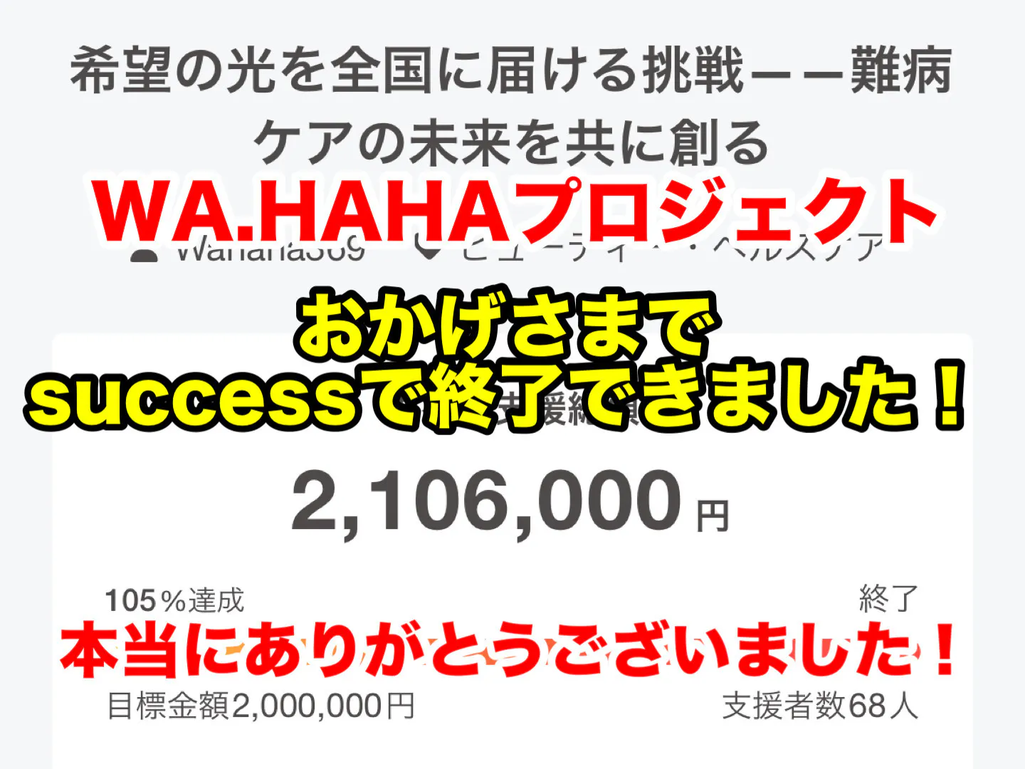 2025/05/31 08:31希望の光を全国に届ける挑戦難病ケアの未来を共に創るWA.HAHAプロジェクト本当に沢山の方々からのご支援いただき無事プロジェクト成立となりました。本当に本当に本当にありがとうございました!!感謝の気持ちでいっぱいです! ●乙巳二黒土星の年らしくコツコツ進んでは壁にぶつかり諦めず前進しては壁にぶつかり…準備に準備を重ねて全速力で駆け抜けた3週間その期間に味わった感覚は皆さんの『あたたかさ』ですぶっちゃけ…冷ややかな視線も感じましたが、、それ以上の温度を感じました結論として『世界はあったかい!!』ホントにグッときます(T T)●支援して下さった方々の想いをずっしり感じながら全国に「希望の光」を届けていきます!クラウドファンディングは終わりましたが…これは僕たちの思い描いている世界への道のりの記念すべき第一章!●第二章は、全国展開ですコツコツ前進して行きます頑張りますので、引き続きご支援よろしくお願いしますまずは難病ケアの未来を共に創るWA.HAHAプロジェクト第一章 終了のご報告とお礼の投稿をさせていただきました!ホントにホントにありがとうございました!! もっと見るクラファン達成しました!!