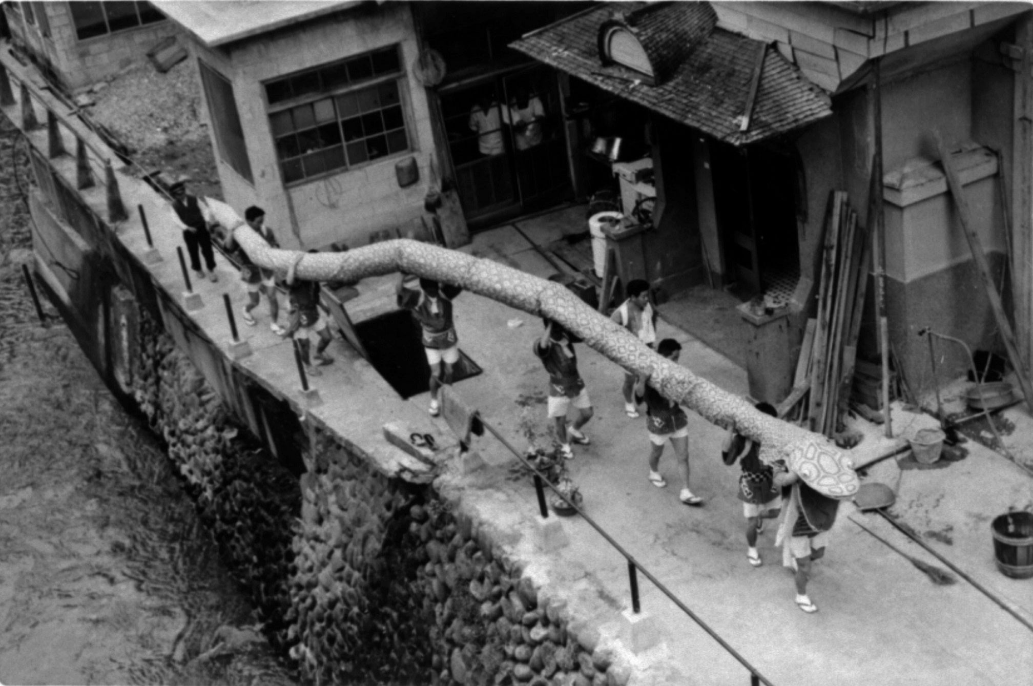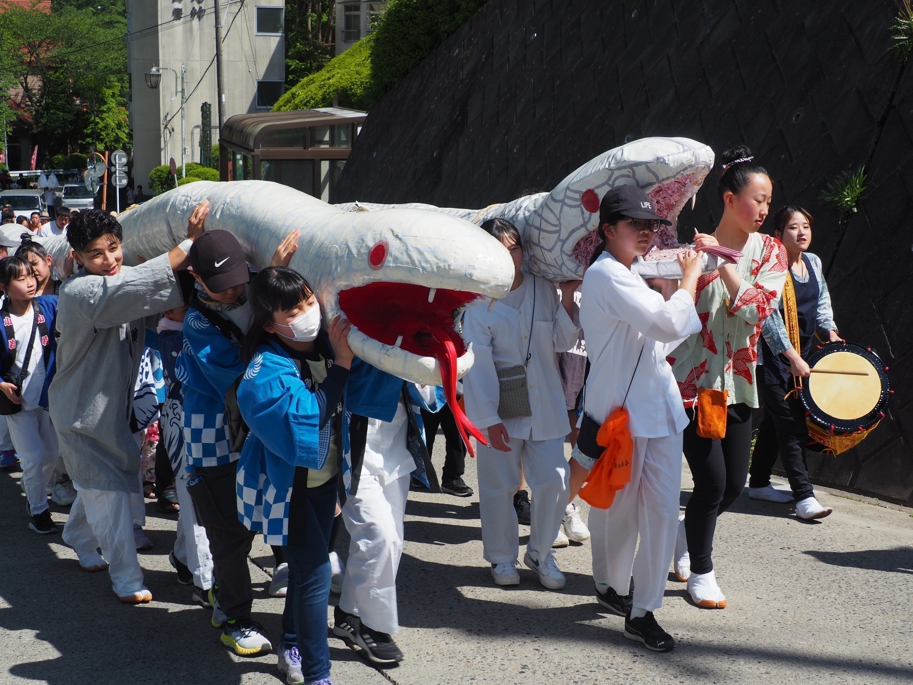 「世界一大きい祭り用ヘビ」108.22mの頭部に乗って温泉街を渡御 |