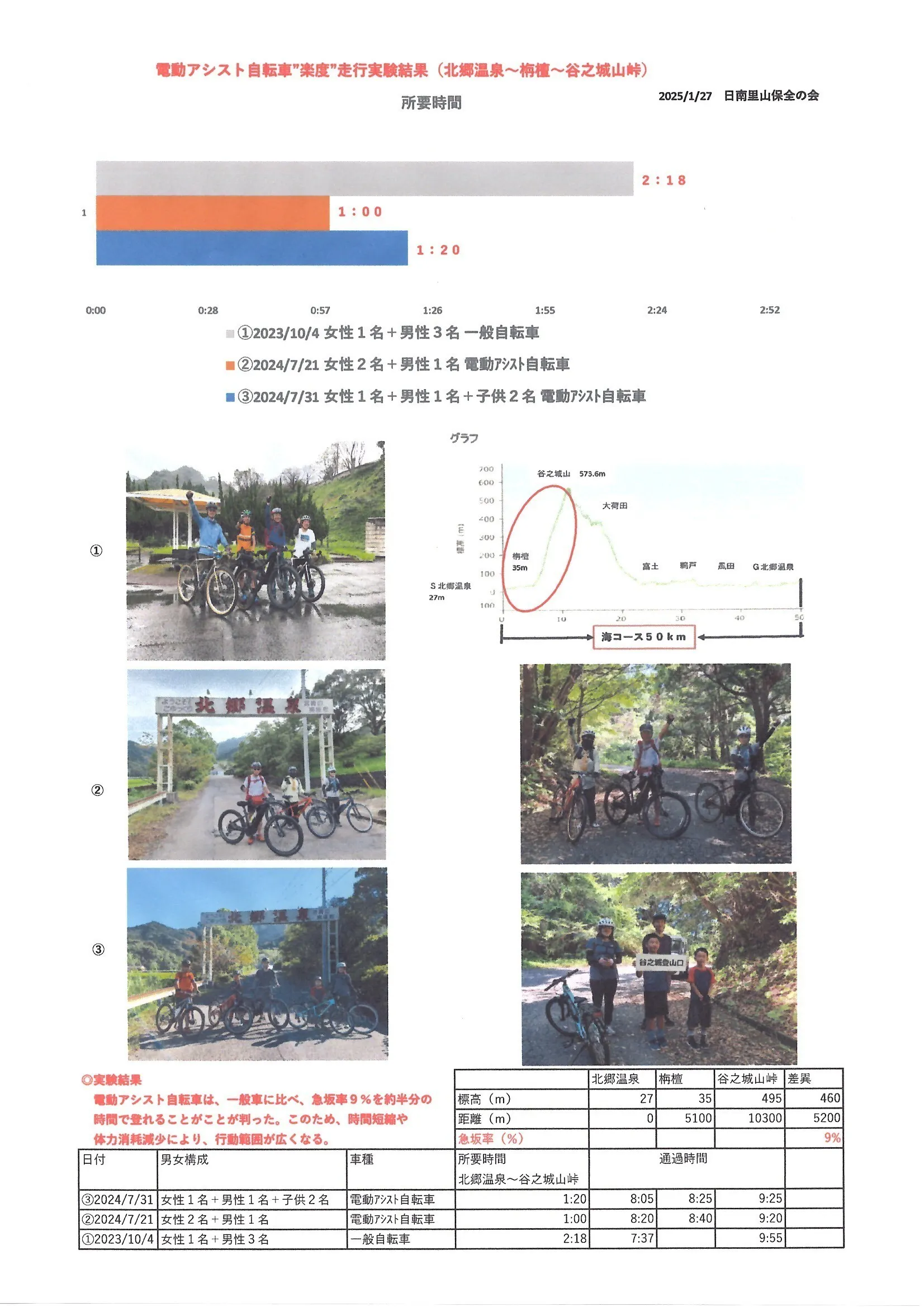 電動アシストを使うと急峻な9%の坂は、子供や女性が一般自転車利用に比べて約半分の時間で登れる”楽度”走行実験を行っています。