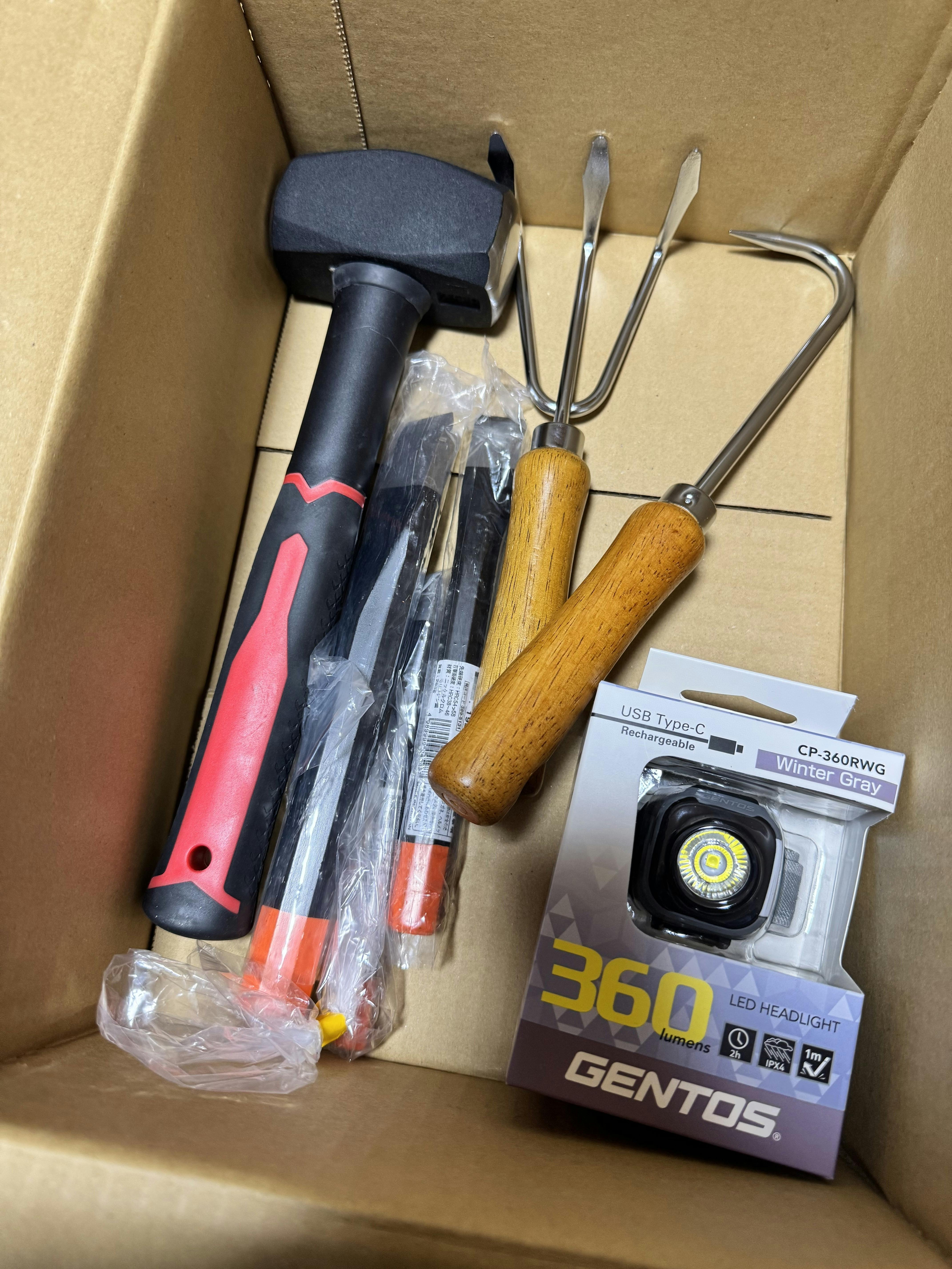 そしてさらに、トレジャーハンターをしに行く私にとっての三種の神器が届きました!「石頭ハンマー」「タガネ」「熊手」です!これらに、スポンサーのリターンをご支援頂きました【t.s.customs】を明記します!