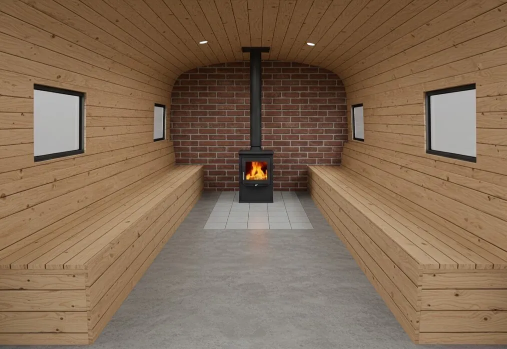 車両最後方の壁にはタイルを貼り、その手前に薪ストーブを設置。