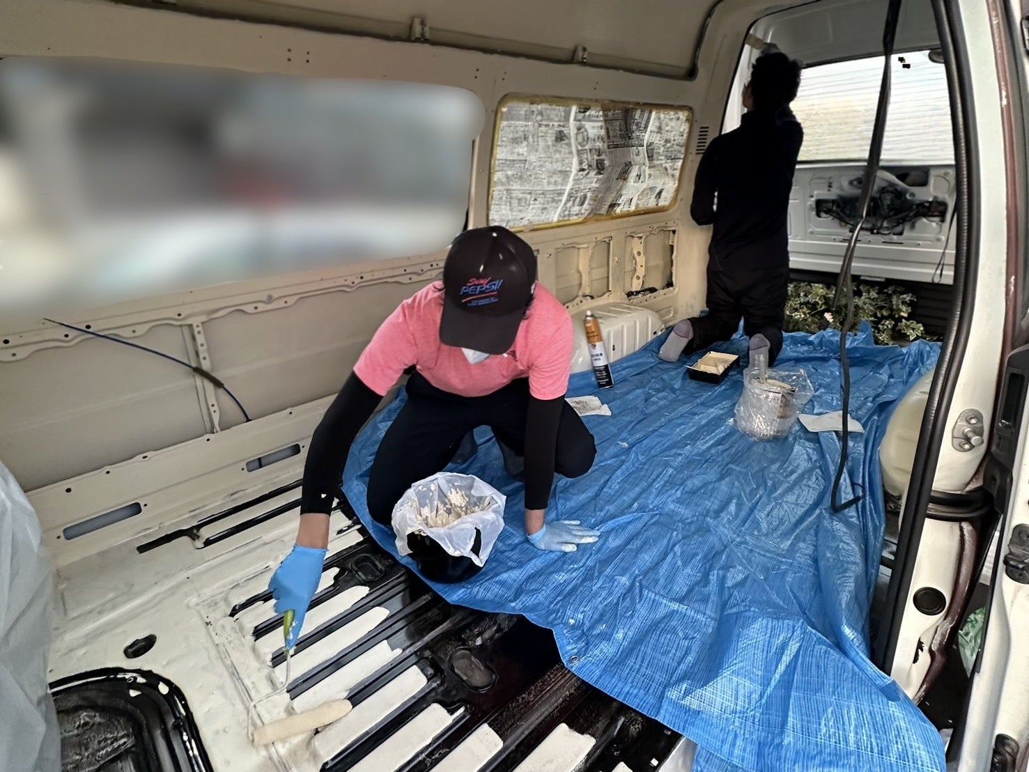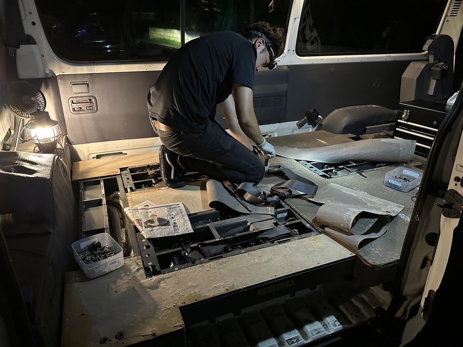 まずは施工のための準備として、車室内の床材や内装材を全て撤去!