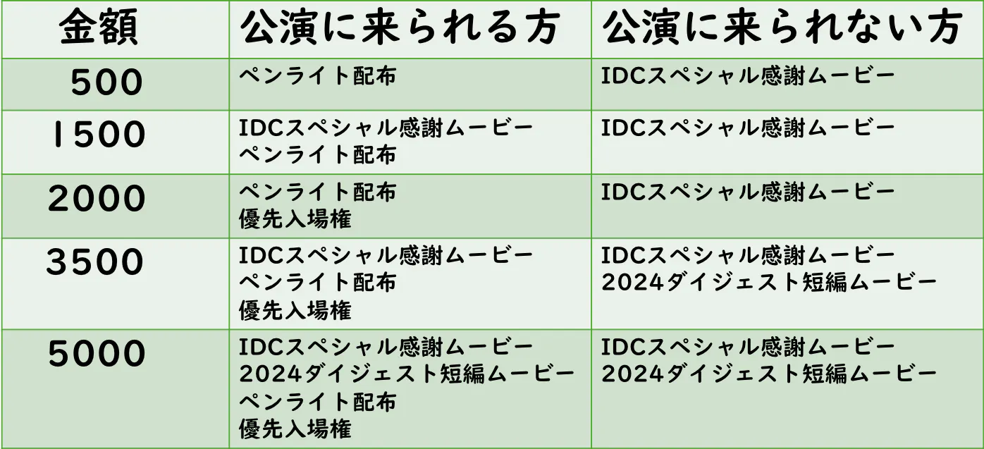 ※優先入場権の時間につきましては、以下【公演のご案内】をご確認ください。また、ご支援いただいた際に表示される確認画面をスクリーンショット等で保存をお願いします。入場の際にご提示が必要になる場合がございます。原則、1人1回のご支援につき、優先権が1つという形になります。ペンライトも同様です。(ただし小学生以下の同伴者がいらっしゃる場合は18歳以上の方とご一緒に入場できます。)