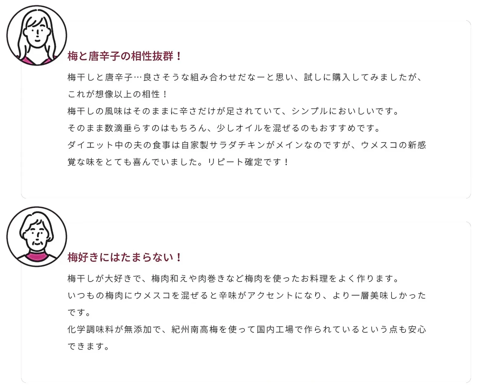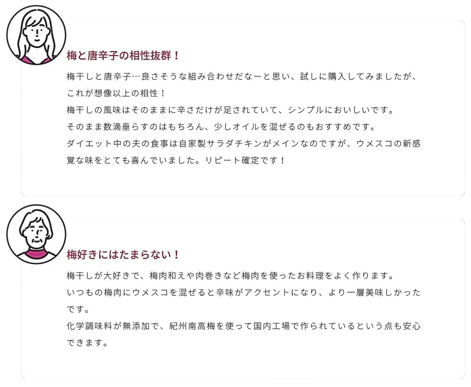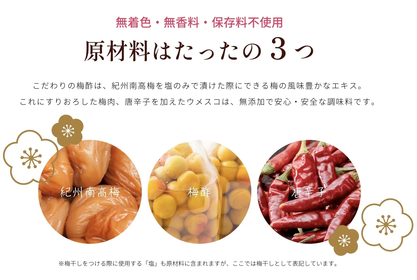 梅干し、梅酢、唐辛子のみを使用。健康志向の方にも安心。