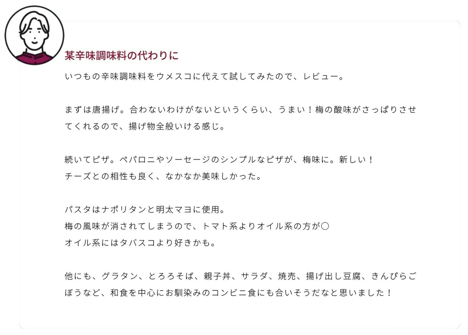梅の酸味と唐辛子のピリッとした辛さが、料理に新しい味わいを加えながらも、身体に優しいのが特長です。