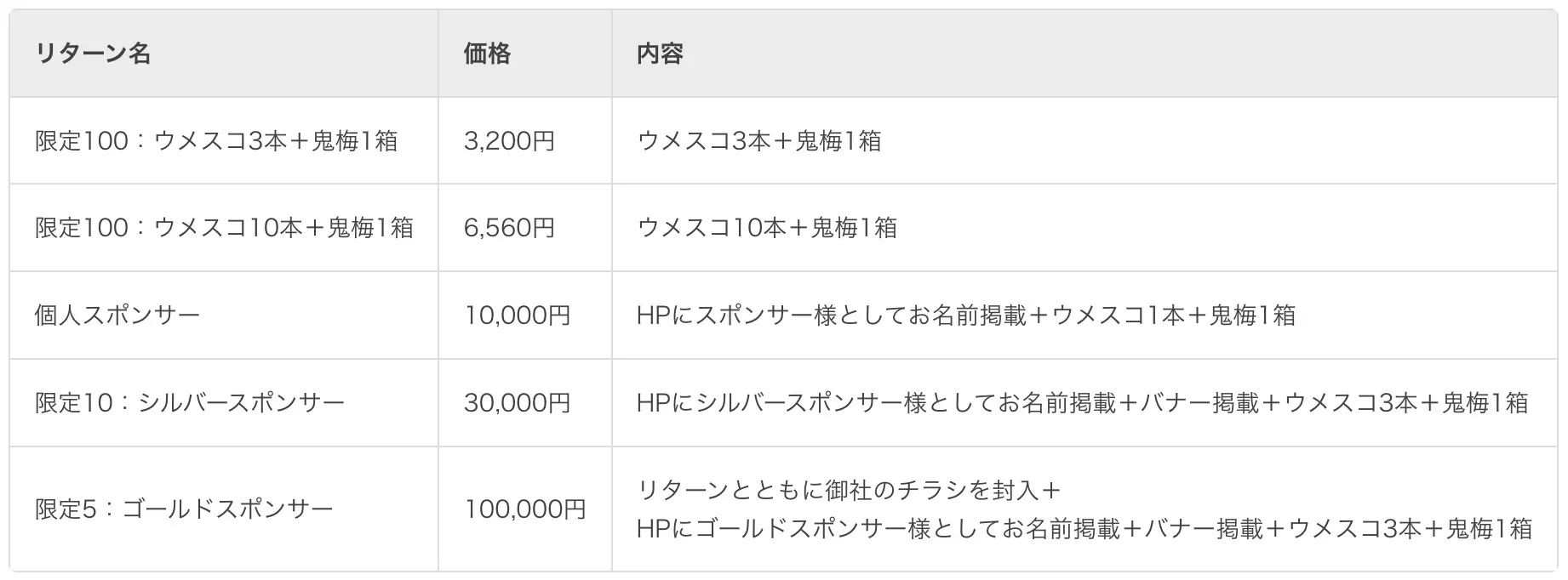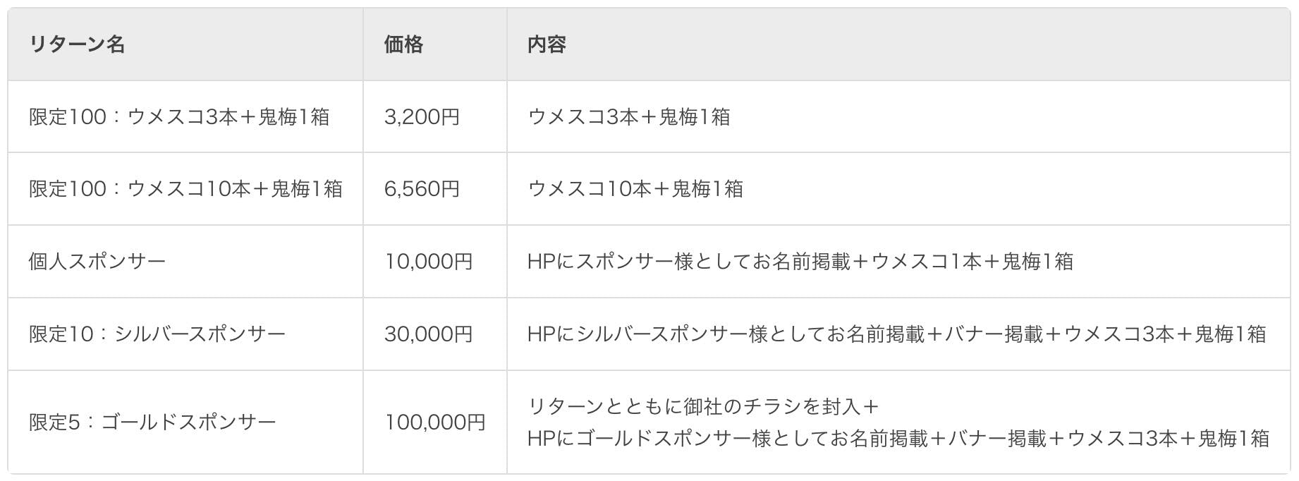 リターンとともに御社のチラシを封入+HPにゴールドスポンサー様としてお名前掲載+バナー掲載+ウメスコ3本+鬼梅1箱