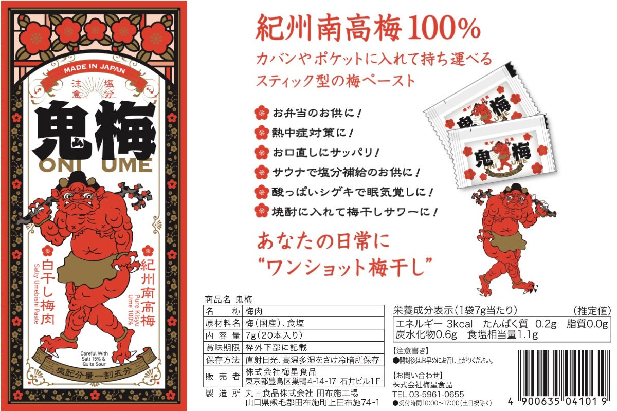 鬼梅とは、梅のペースト状のものを一口サイズのパウチにわけている(梅の果肉100%)製品で、弁当に入れたり、お口直しのフリスクがわりの活用や、サウナの時の水分栄養補給にも活用いただけます。