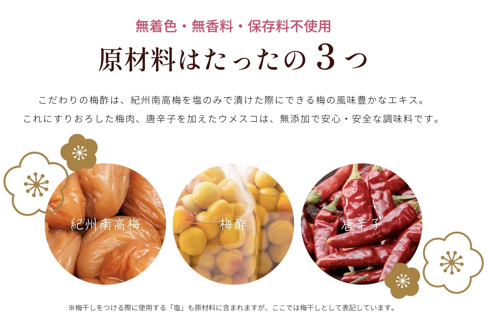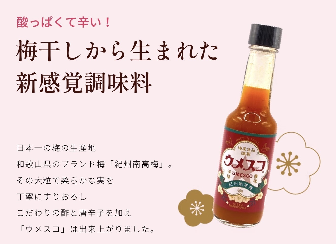 ウメスコは、梅干し、梅酢、唐辛子だけで作られたシンプルで自然な調味料です。