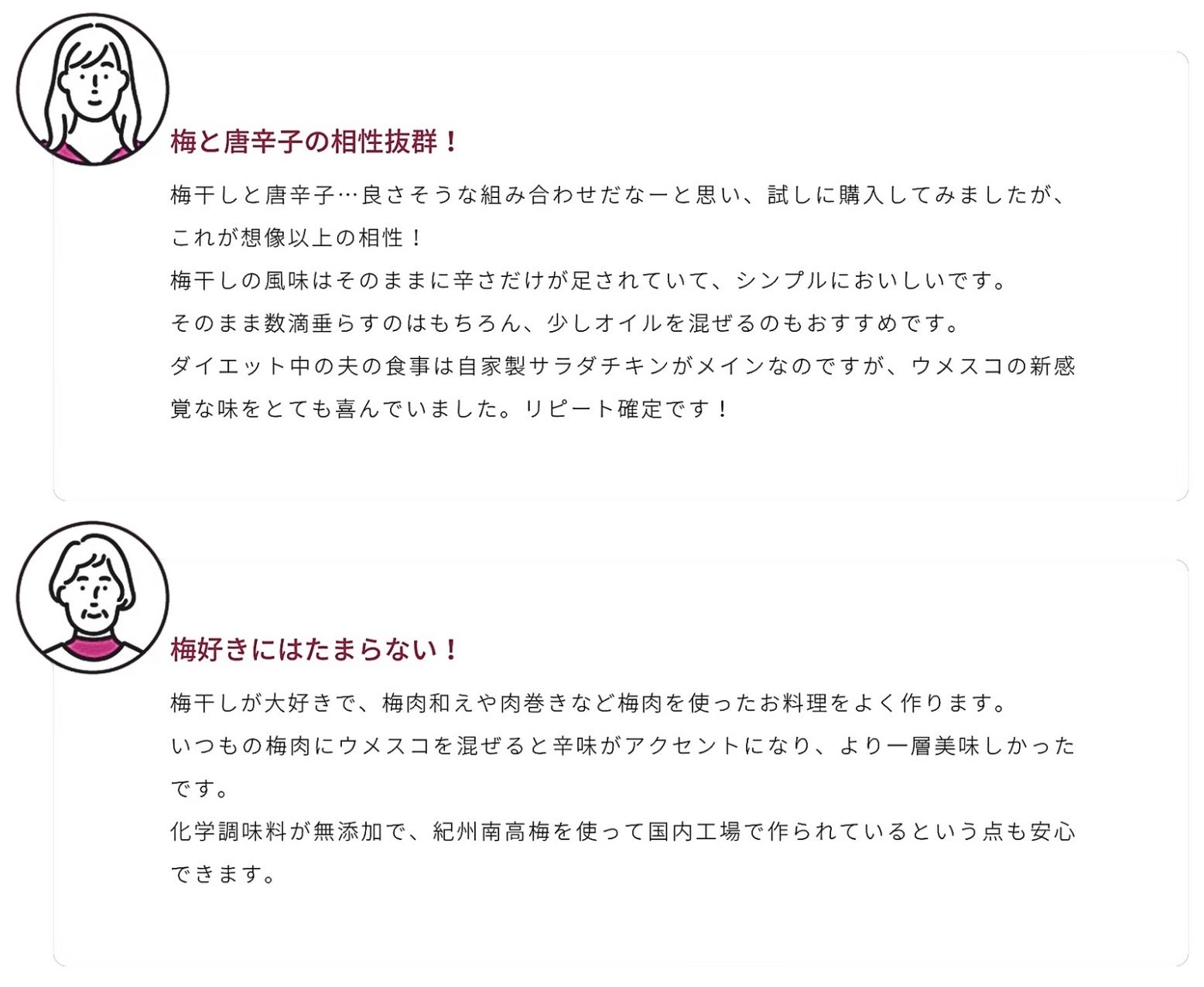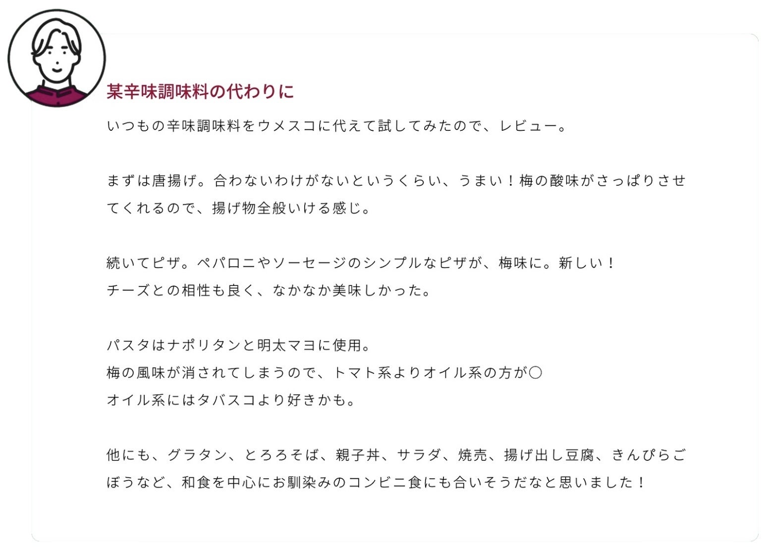 梅の酸味と唐辛子のピリッとした辛さが、料理に新しい味わいを加えながらも、身体に優しいのが特長です。