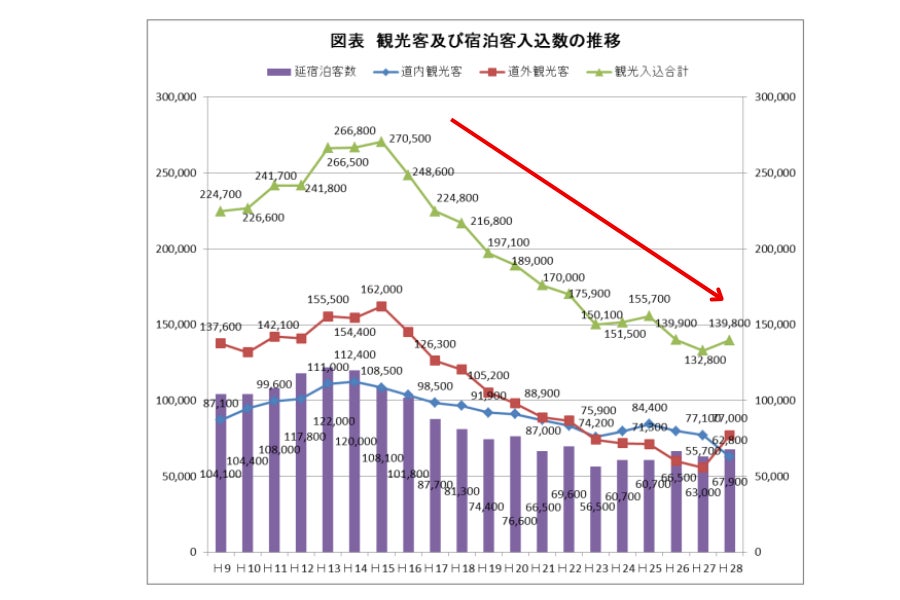 近年、北海道はインバウンド需要の高まりにより、同じ北海道でもニセコや登別といった観光地には多くの外国人観光客が訪れています。しかし、利尻島の観光客数は年間約20万人で、2024年現在でも年々減少傾向にあり、インバウンドによる集客はまだ大きく伸びていない状況です。