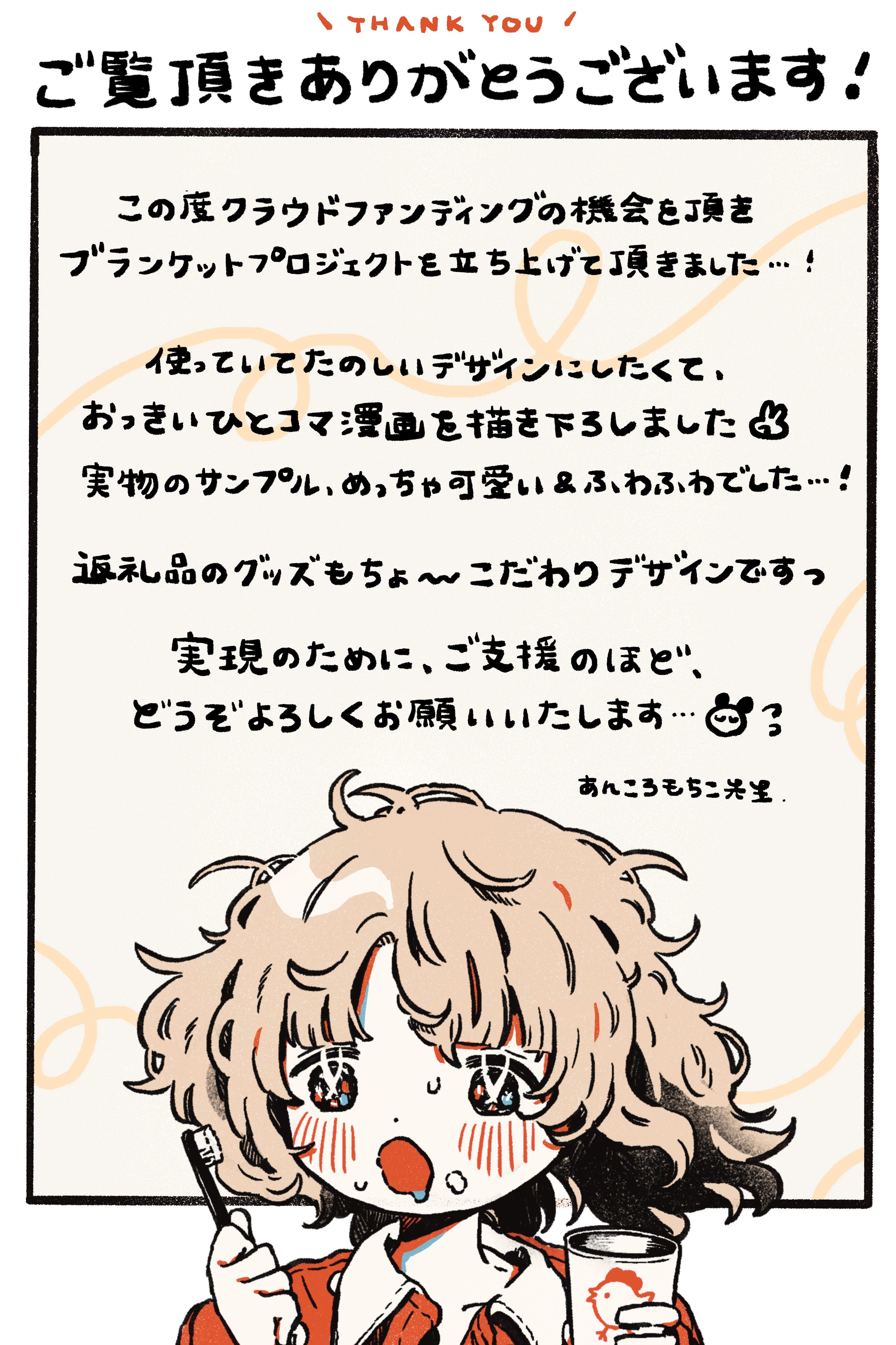 2025/02/13 18:00Creationスタッフです。可愛い研究所ひとコマ漫画ブランケットprojectへのご支援ありがとうございます!皆様のたくさんのご支援のおかげで・・・\\ 商品化が決定いたしました //ここからは受注販売と同じ仕組みになり、ご支援すると必ず商品が届きます!クラファン終了日は【3月2日 23:59】です!ぜひ買い逃しのないようご支援よろしくお願いします♪ もっと見る
