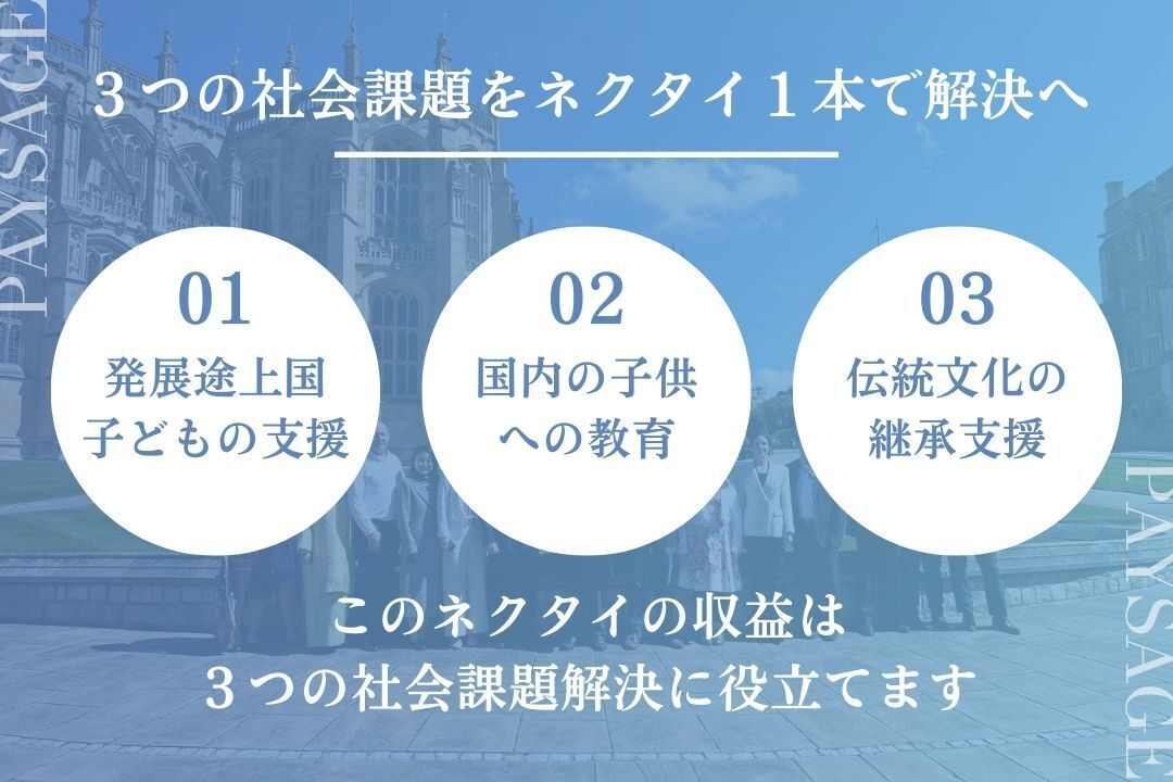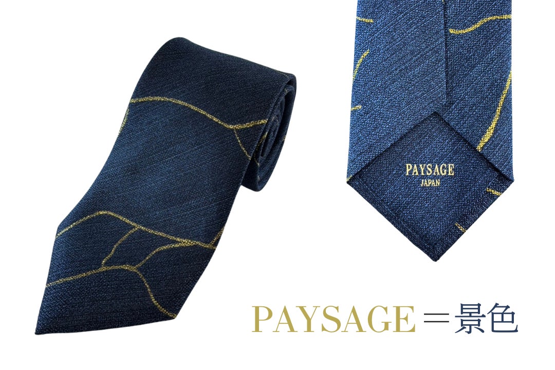 日本伝統の技術である「金継ぎ」や世界的に評価されている「勿体無い」「侘び寂び」など日本が誇る文化をファッションアイテムとして世界へ。 世界の文化を日本を含めた世界へ。 京都の伝統工芸「西陣織」とコラボし日本文化を 世界へ発信するネクタイそれが「PAYSAGE」です。