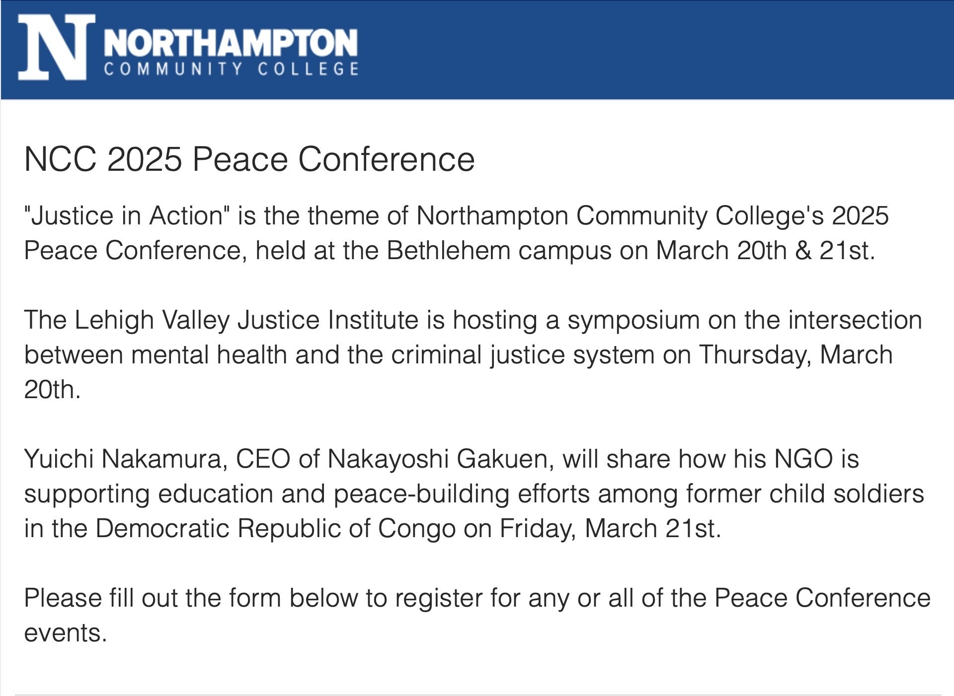 皆さまの温かいご支援のおかげで、なかよし学園はアメリカ・Northampton大学にて開催された平和講演会において、大トリとして講演を行う機会をいただきました。