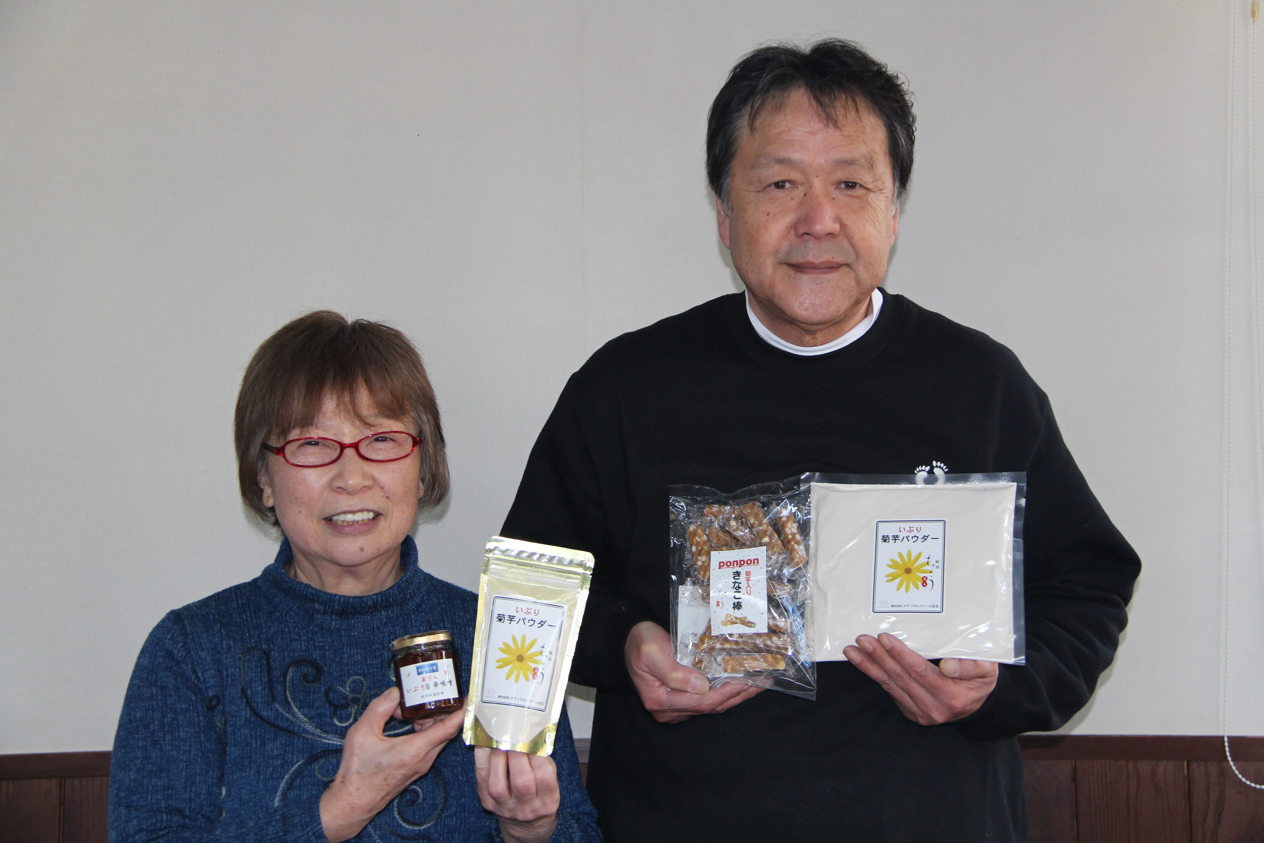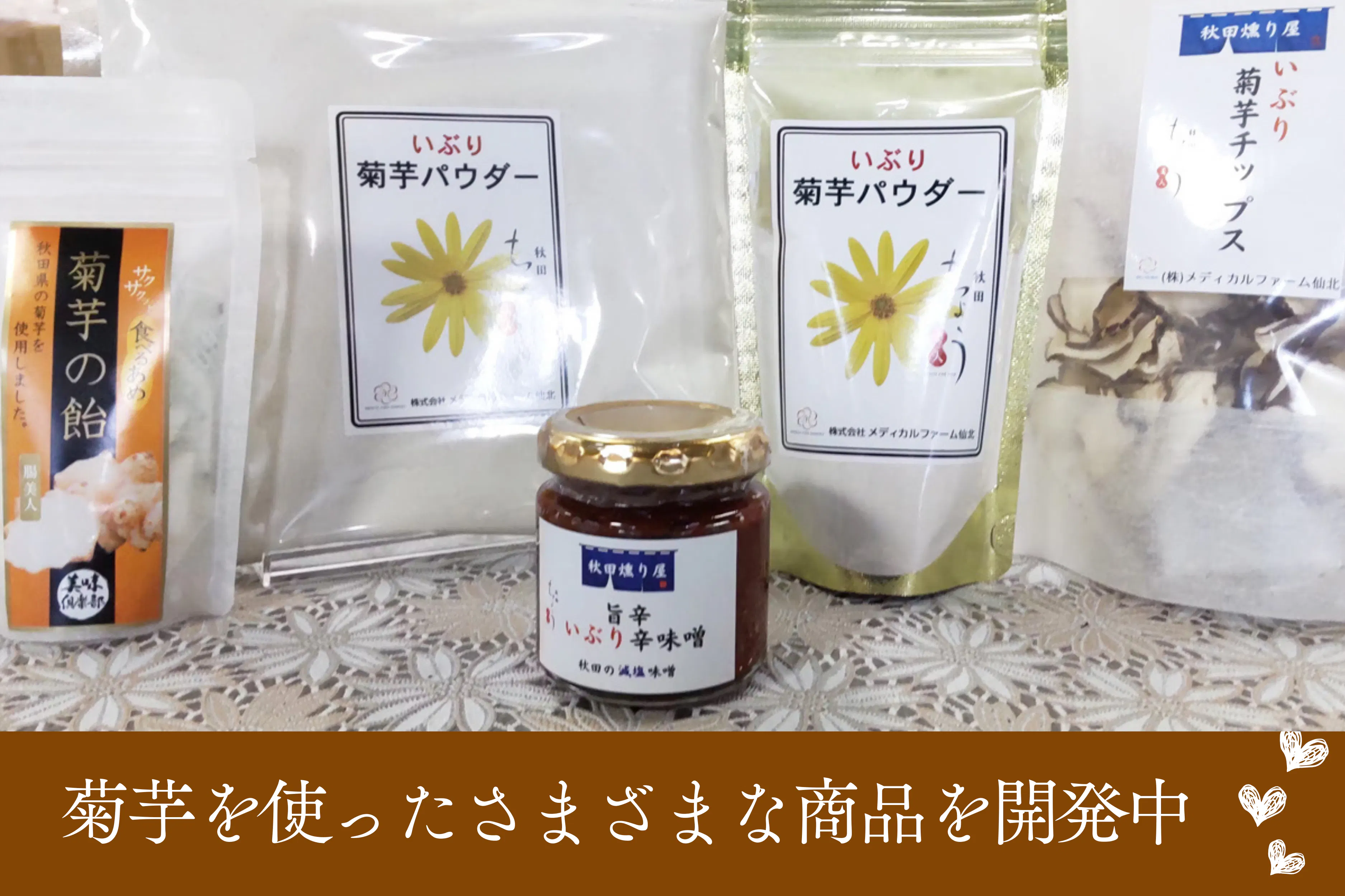 私たちメディカルファーム仙北は「イブリ菊芋®(商標登録第5891340号)」や「秋田ちょう美人®(商標登録第5896738号)」他で差別化を図っており、独自の商品「いぶり菊芋パウダー」や「いぶり菊芋チップス」などを販売しています。